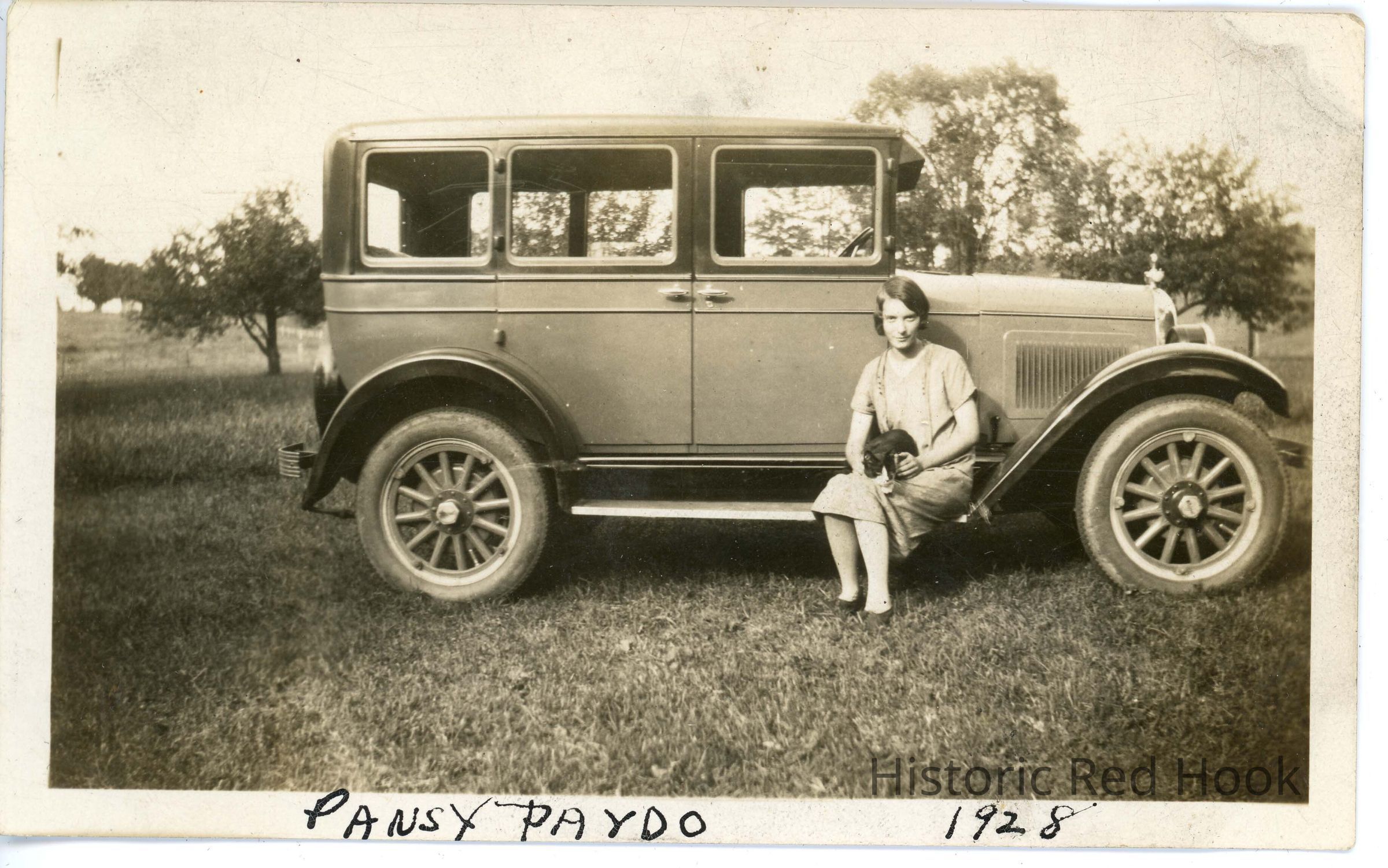 Camper sitting on fender of a car. 'Pansy Pardo 1928' written on border