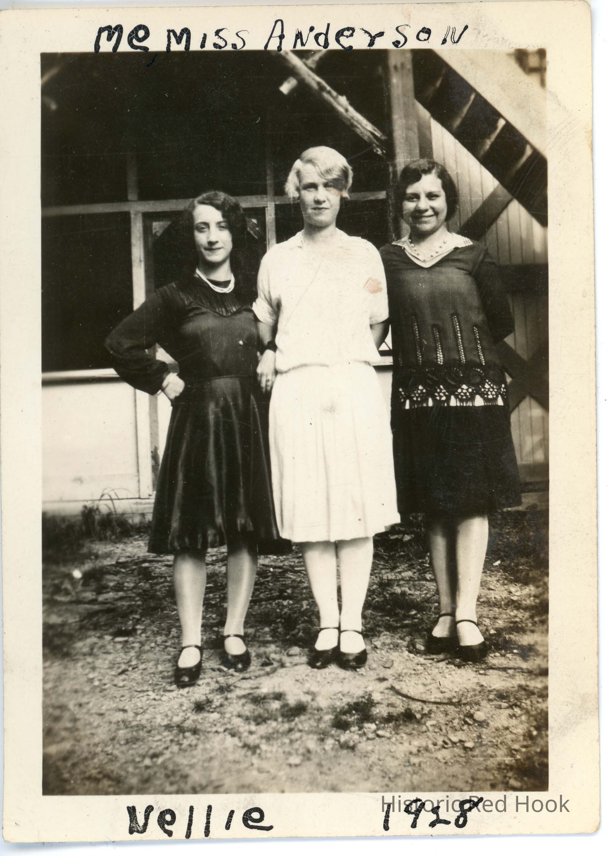 Three women posing. 'Me, Miss Anderson, Nellie 1928' written on border