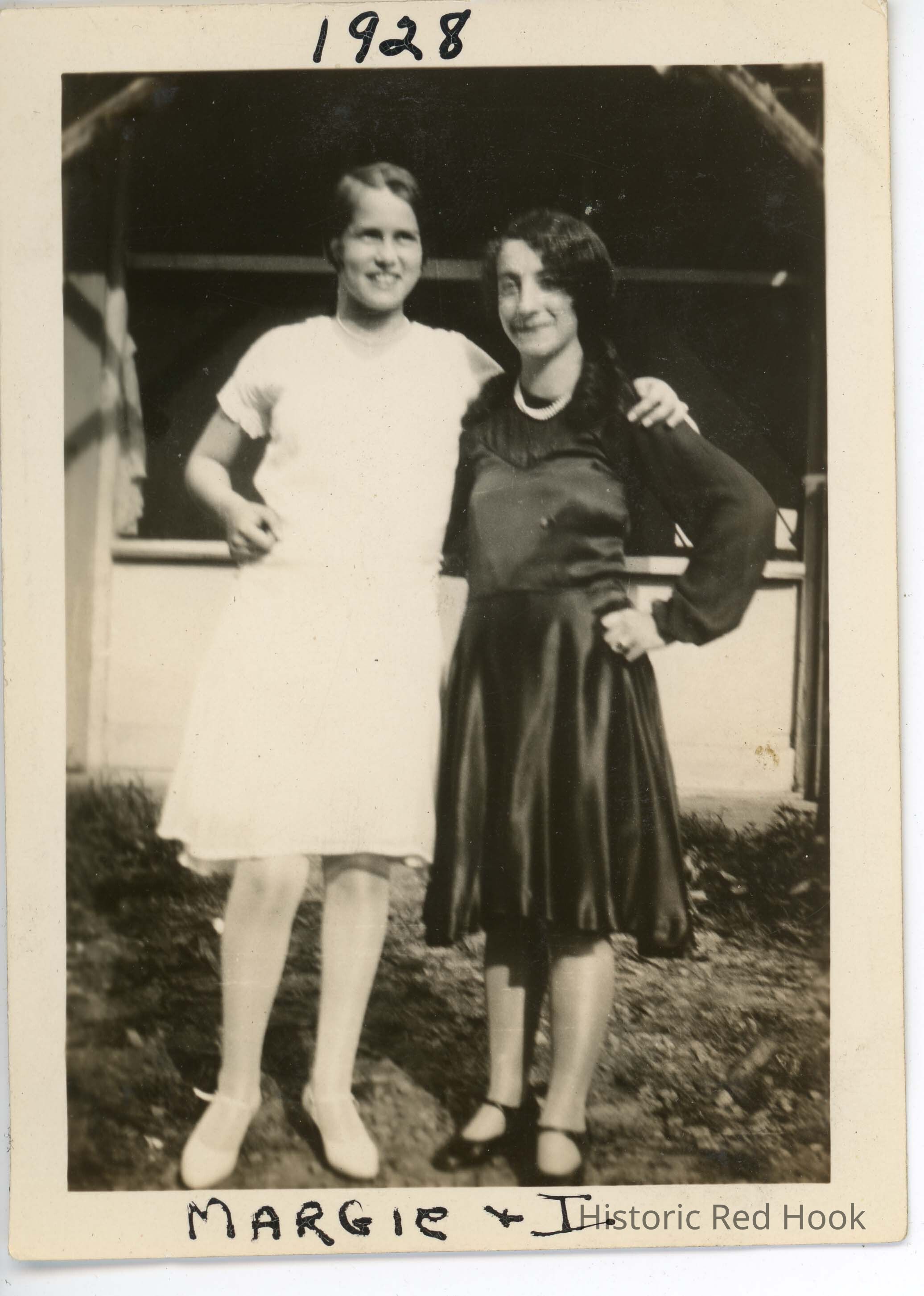 Two girls posing. Hand written on the border of the photo: "Margie & I, 1928"