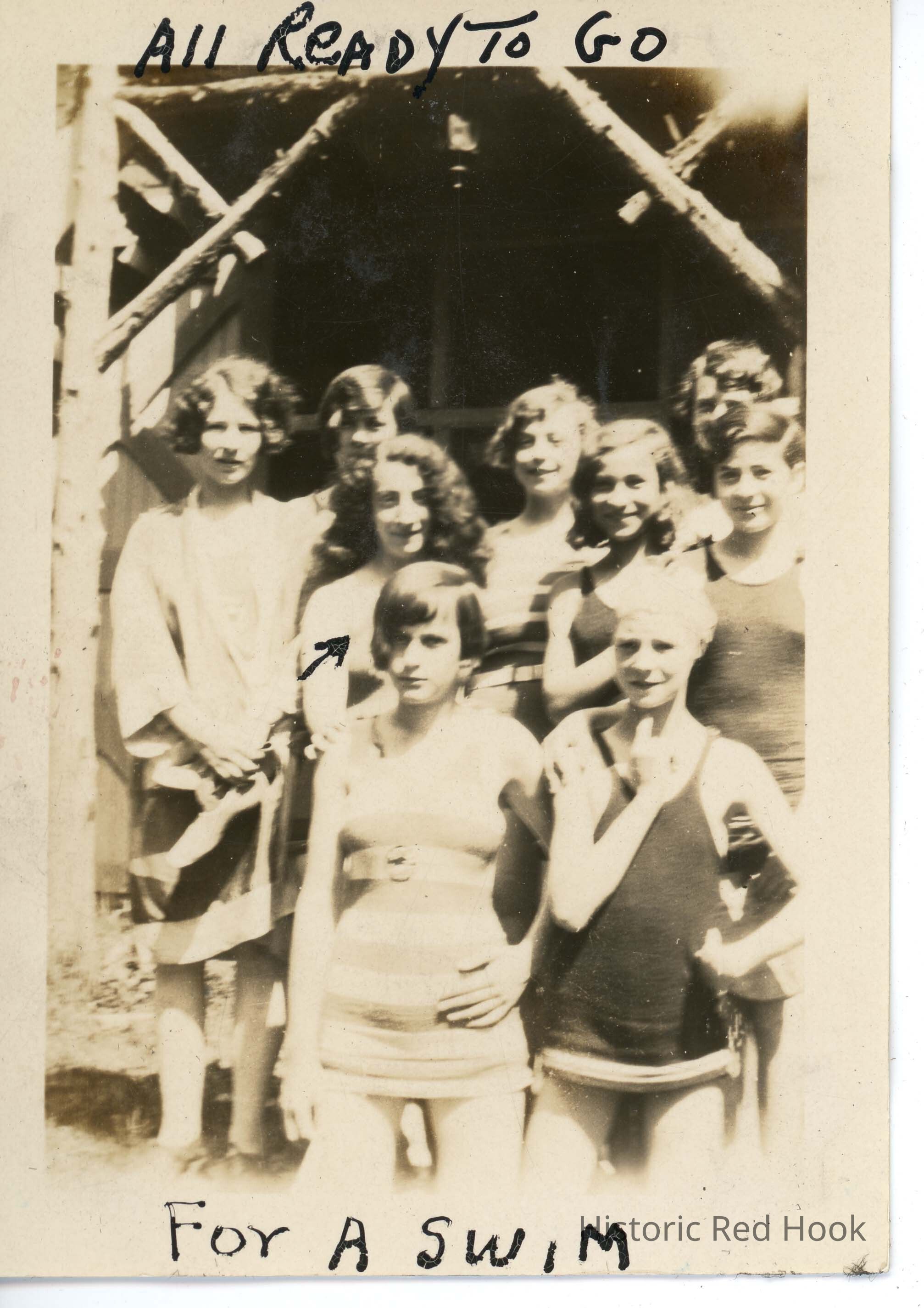 Nine campers posing in bathing suits. 'All ready to go for a swim' written on border.