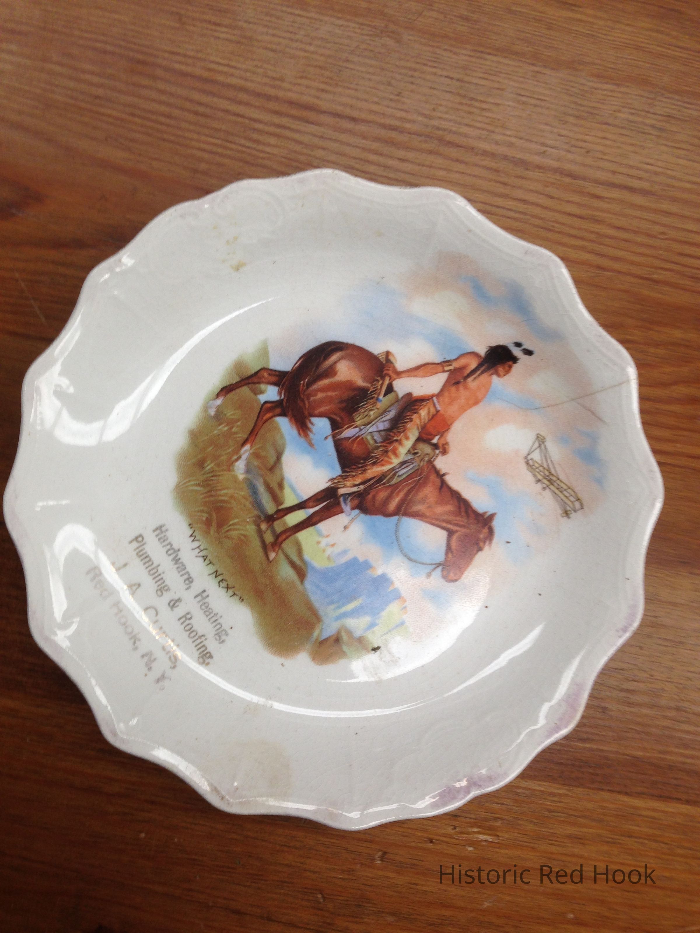 A decorative plate with artwork of native american on a horse