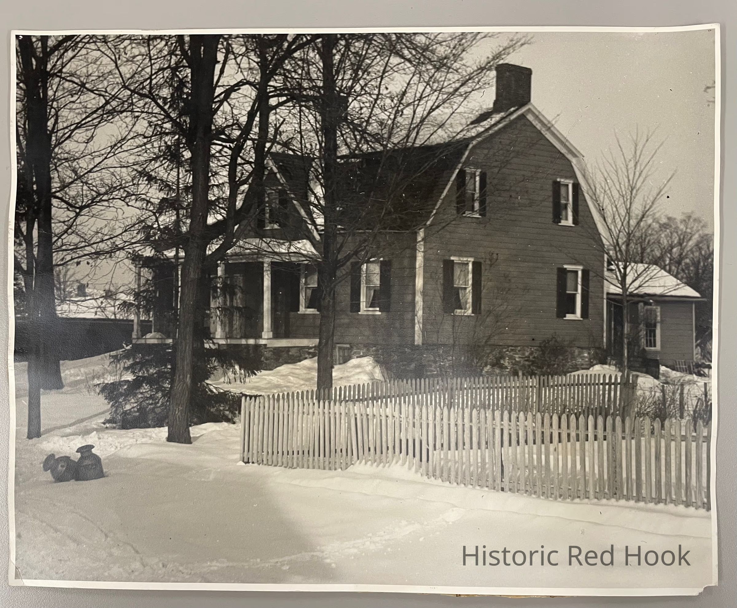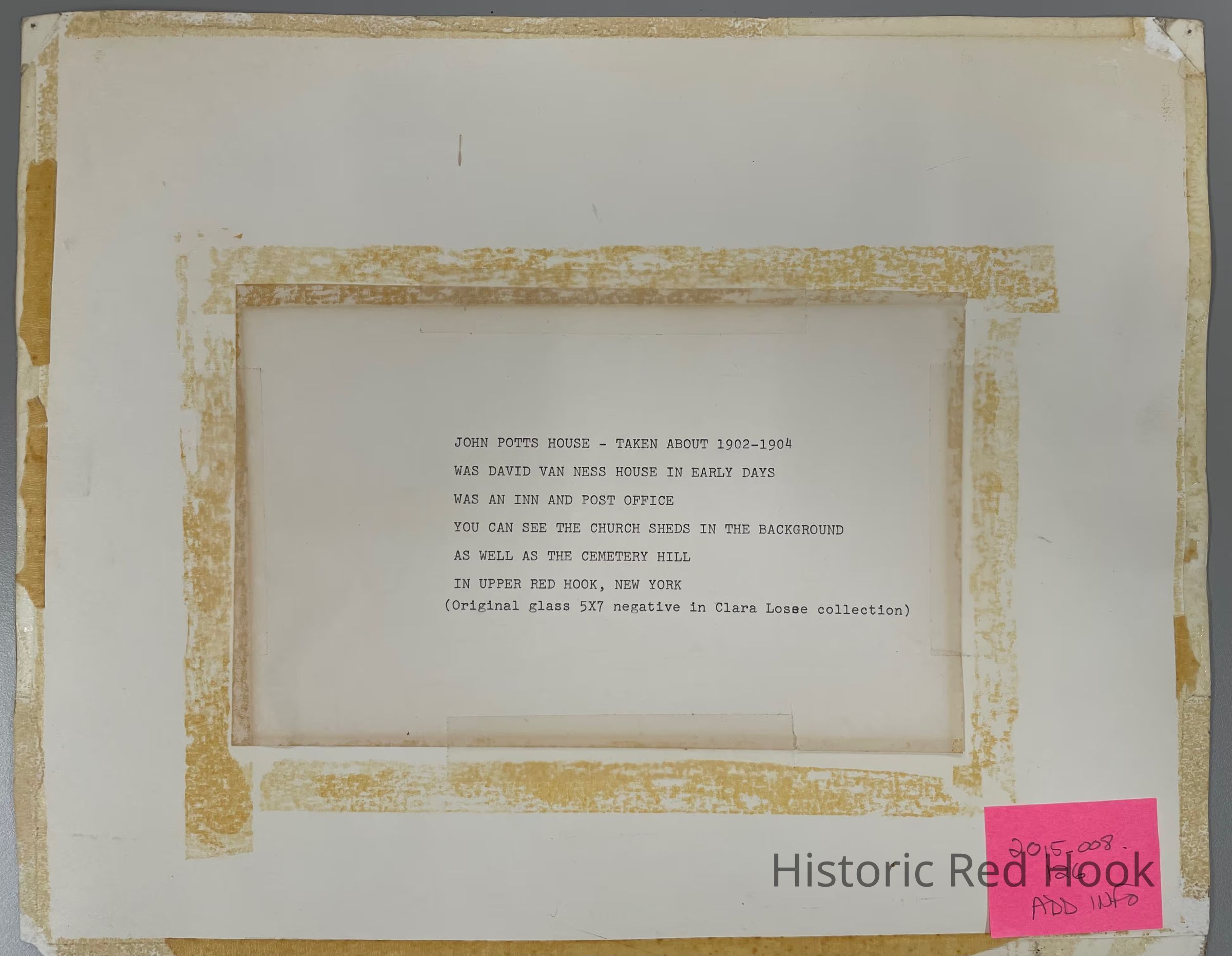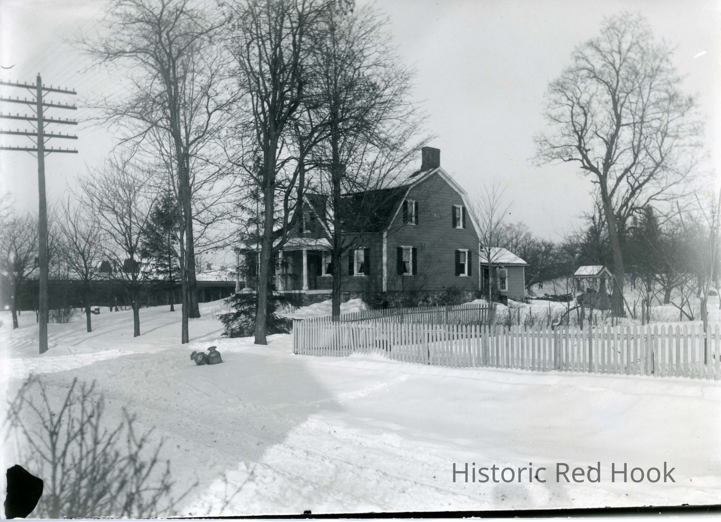 John Potts House-Taken about 1902-1904 was the David van Ness House in the early days. Used as a Post office and Inn. You can see the Church sheds and in the background as well as the Cemetery Hill in Upper Red HookCollection