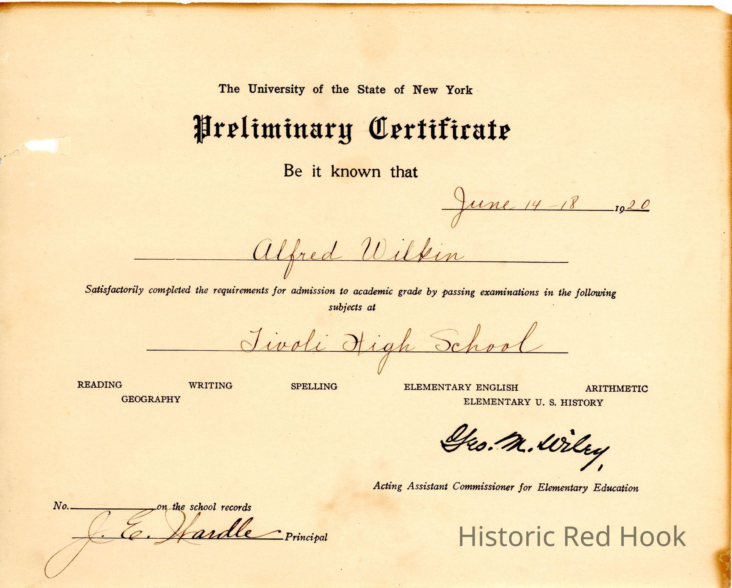 Preliminary certificate, Tivoli High School, Alfred Wilken, 1920Entry/Object ID