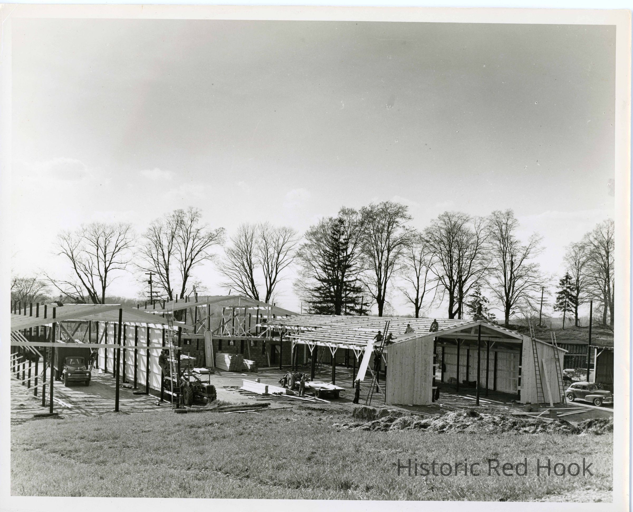 Barn-raising on Thomson property. This photo is an over view of the barn in progress.Collection