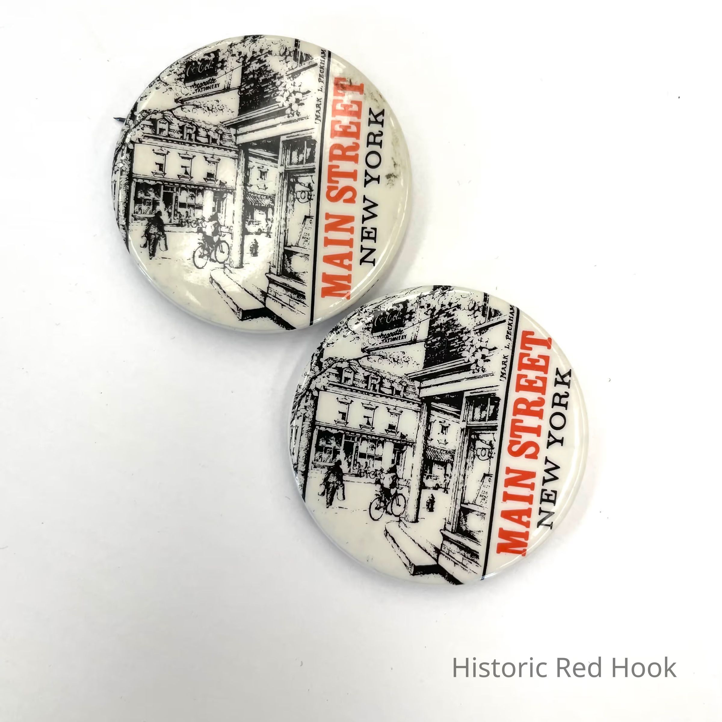 Metal pin with illustration of Red Hook village and words - 'Main Street, New York'Collection