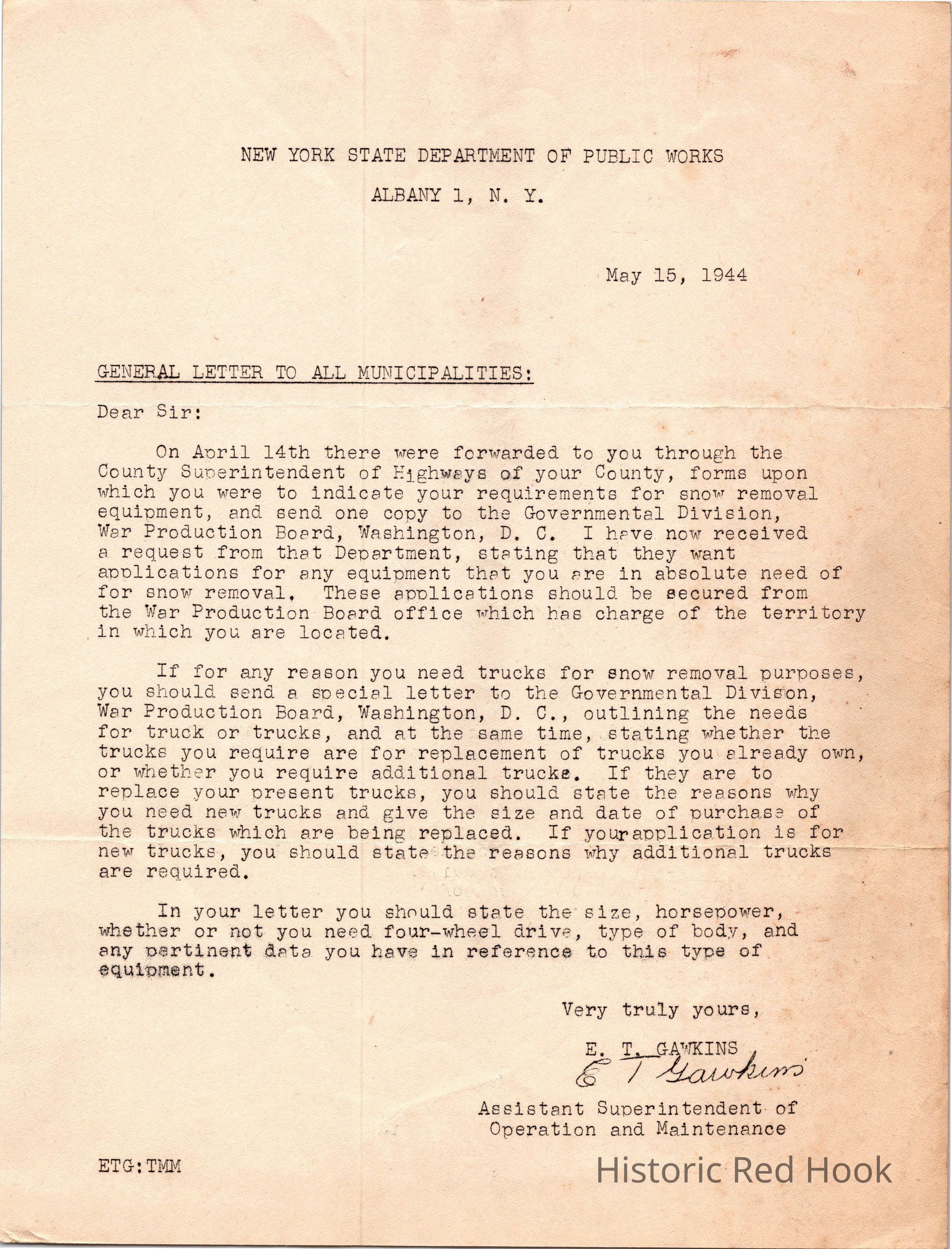 Letter sent to local communities from the NY State Dept. of Public Works. Advises how to request new plowing equipment during wartime.