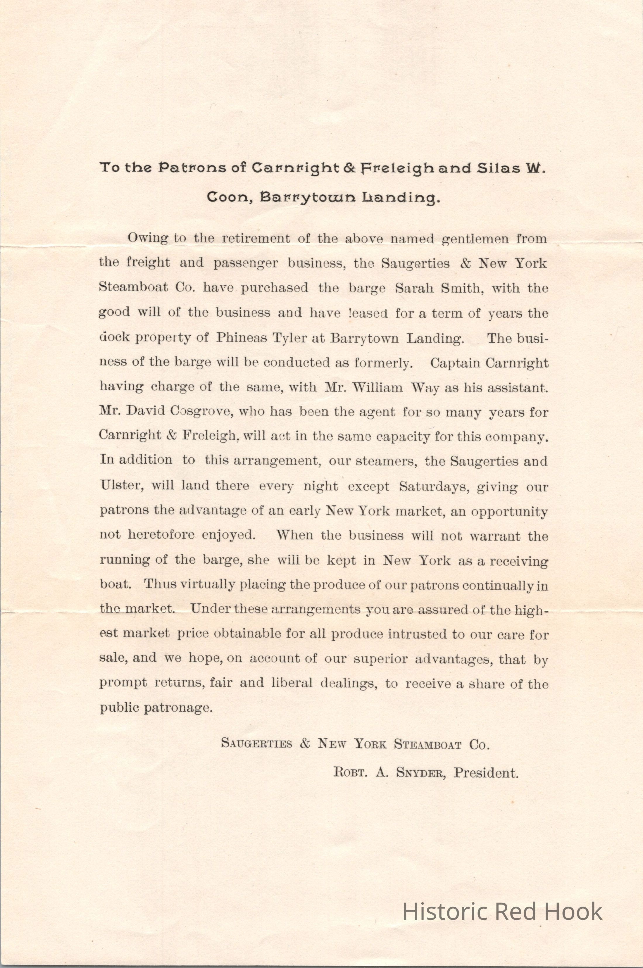 Teator Collection: Purchase notice of Carnright & Freleigh and Silas W. Coon of Barrytown by the Saugerties & New York Steamboat Co. to the patronsRelationships