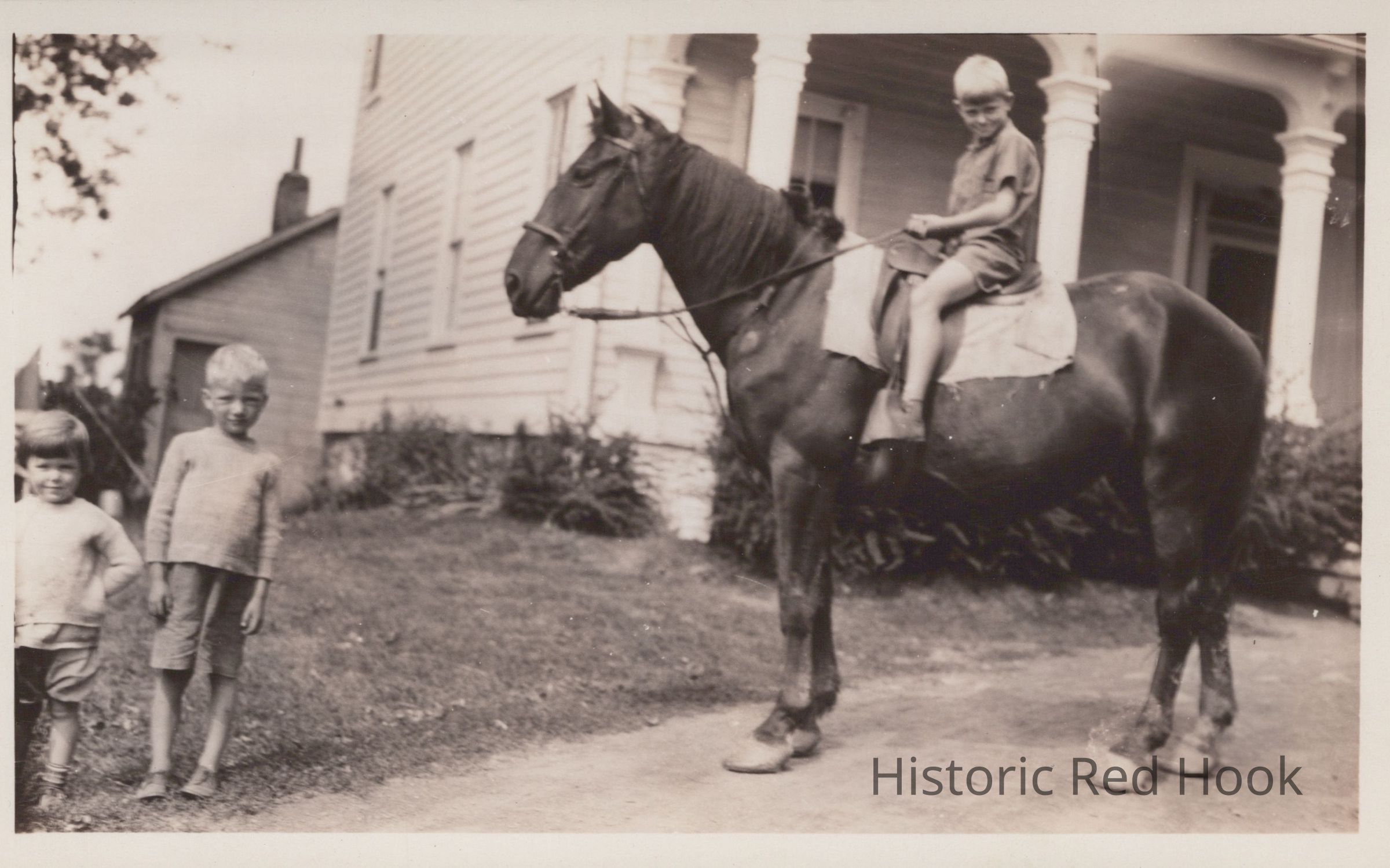 Rachel, Sidney and Gordon Mead(on horseback), summer 1930, summer kitchen behind the house.Photograph Details