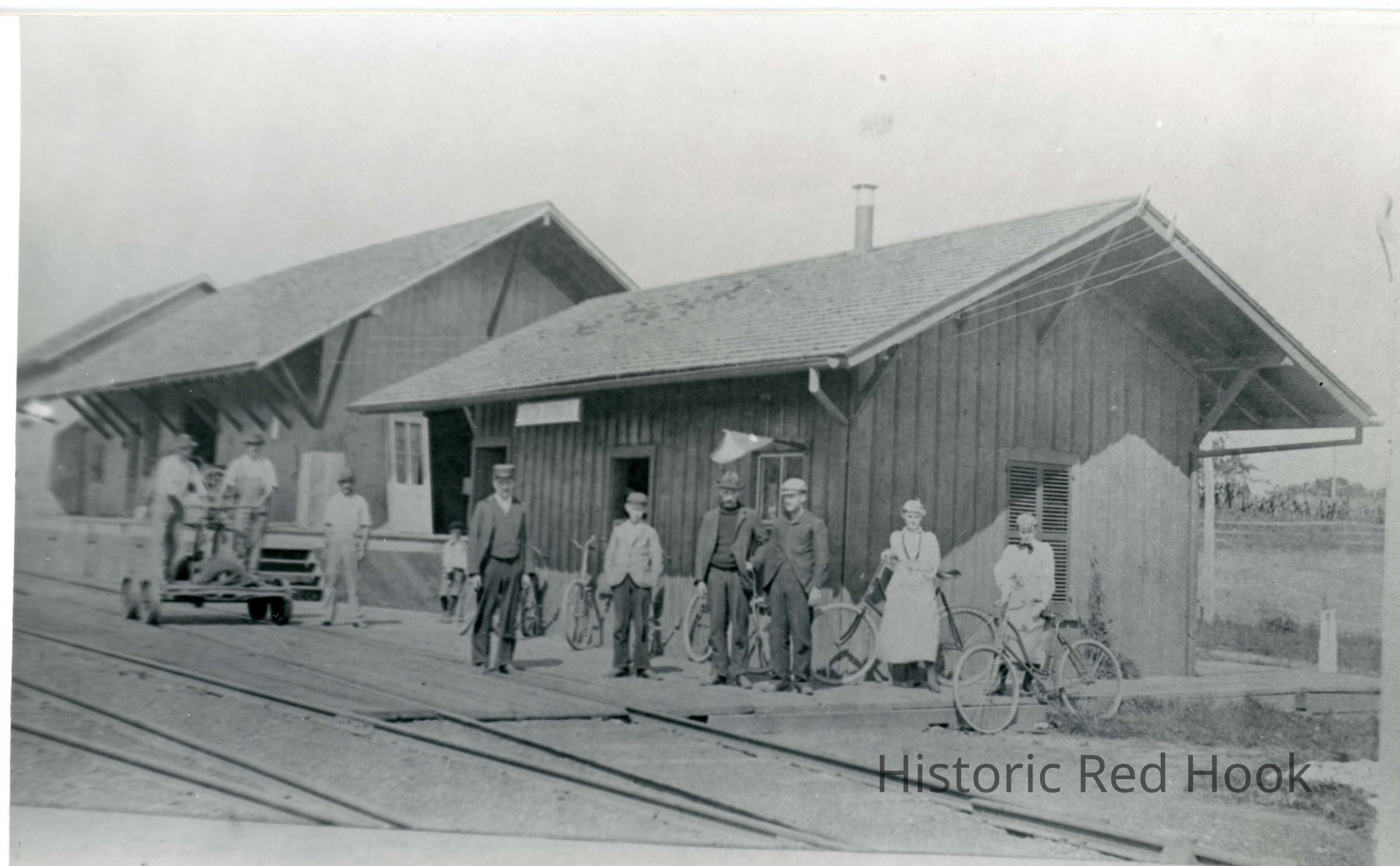 Freight house next to CNE railroad tracks. Several people waiting with their bicycles and workers.
