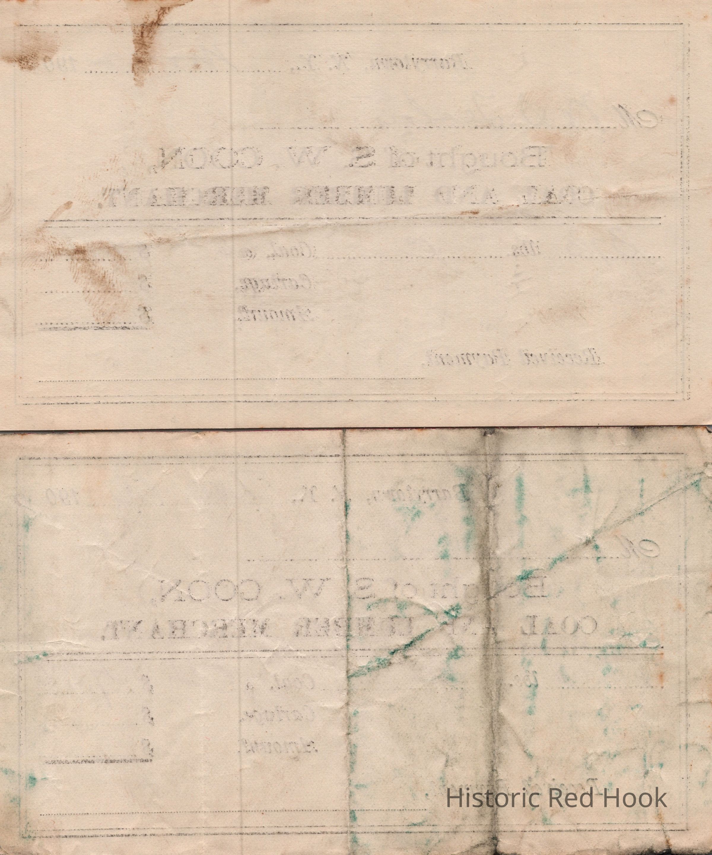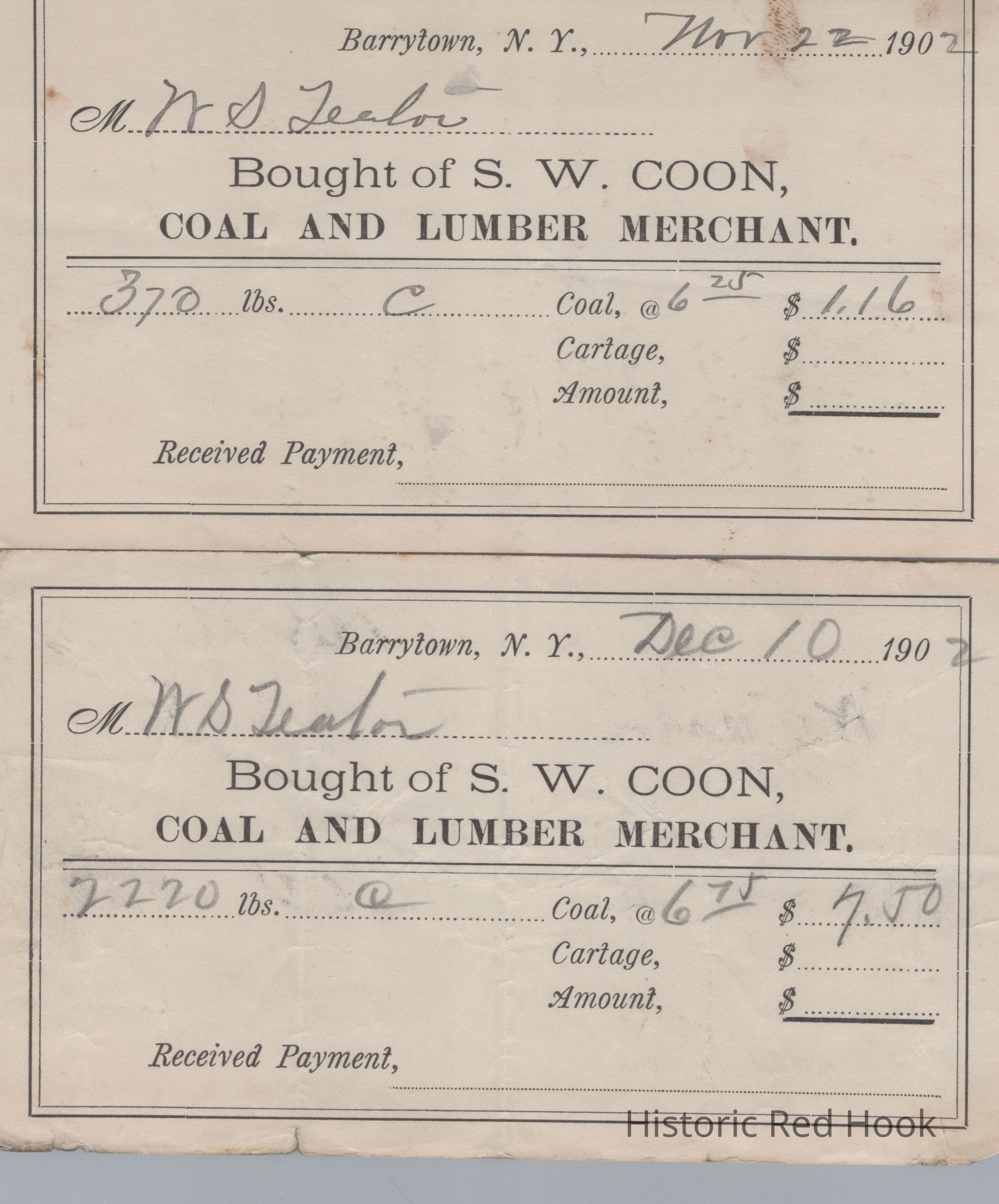 Two receipts from S. W. Coon, Coal and Lumber Merchant, Barrytown, NYRelationships