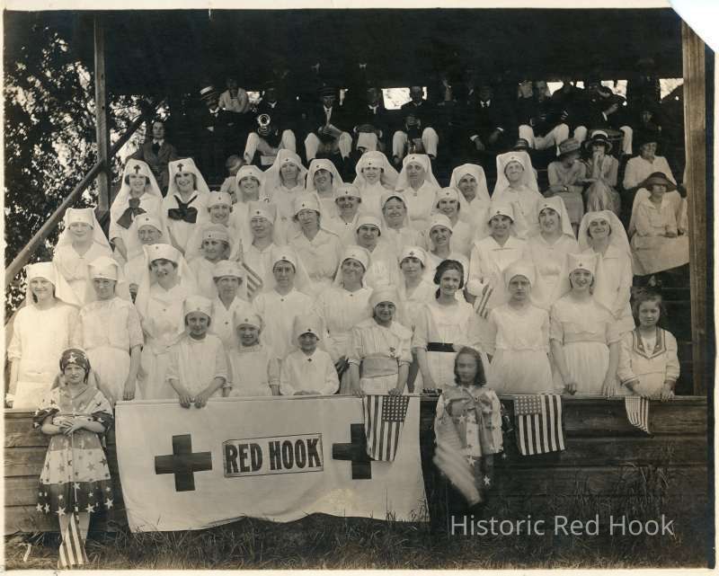 Red Cross nurses group at WWI event in Chanler Park, c 1917. Two girls in garments with stars stand on either end of a banner that says Red Hook with red cross symbols on either side. Original print mounted on cardboard in oversize drawer (2016.010.001)Photograph Details