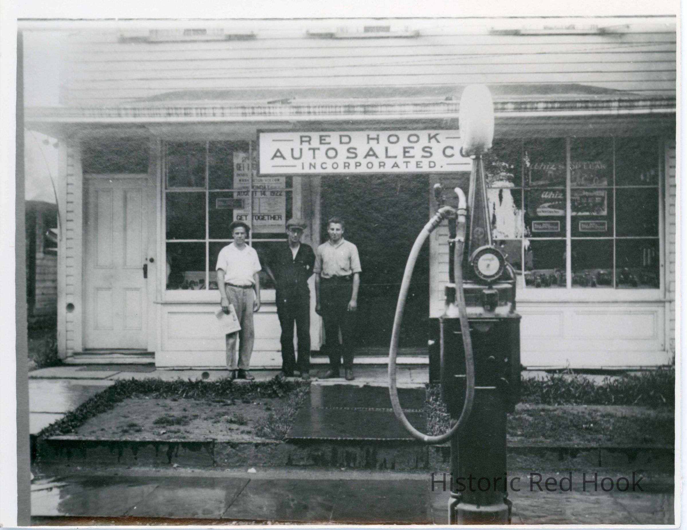 Red Hook Auto Sales Co, Inc with gas pump in front and three men standing. Written on back of photo "Boice Garage." c1930s.(Doc Boice Garage, father of Elwood Boice)Not to be confused with Boyce's Garage on South Broadway. (Was this the tobacco building??)Photograph Details