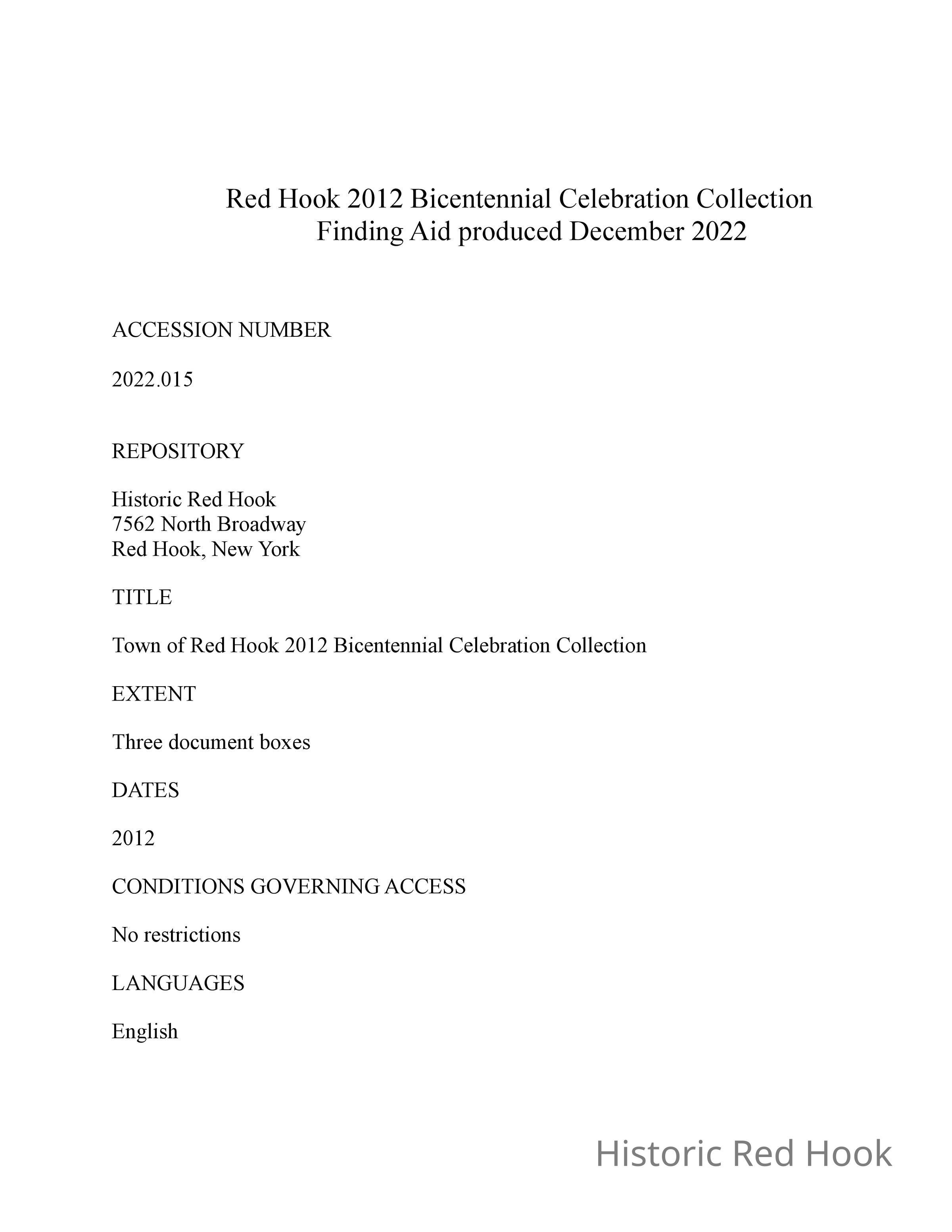 Red Hook Bicentennial Collection Finding Aid and Media List