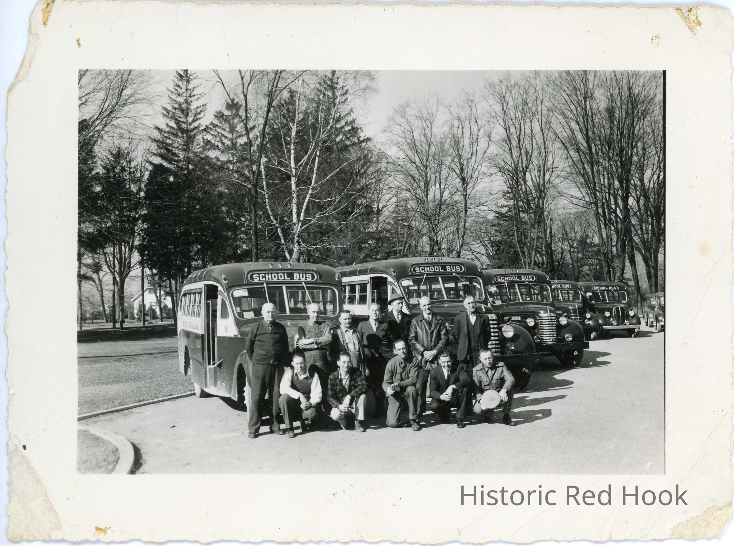 A group of twelve men sitting and standing by five Red Hook Central school buses, identified as bus drivers. The photo is undated but probably in the 1940's.Photograph Details