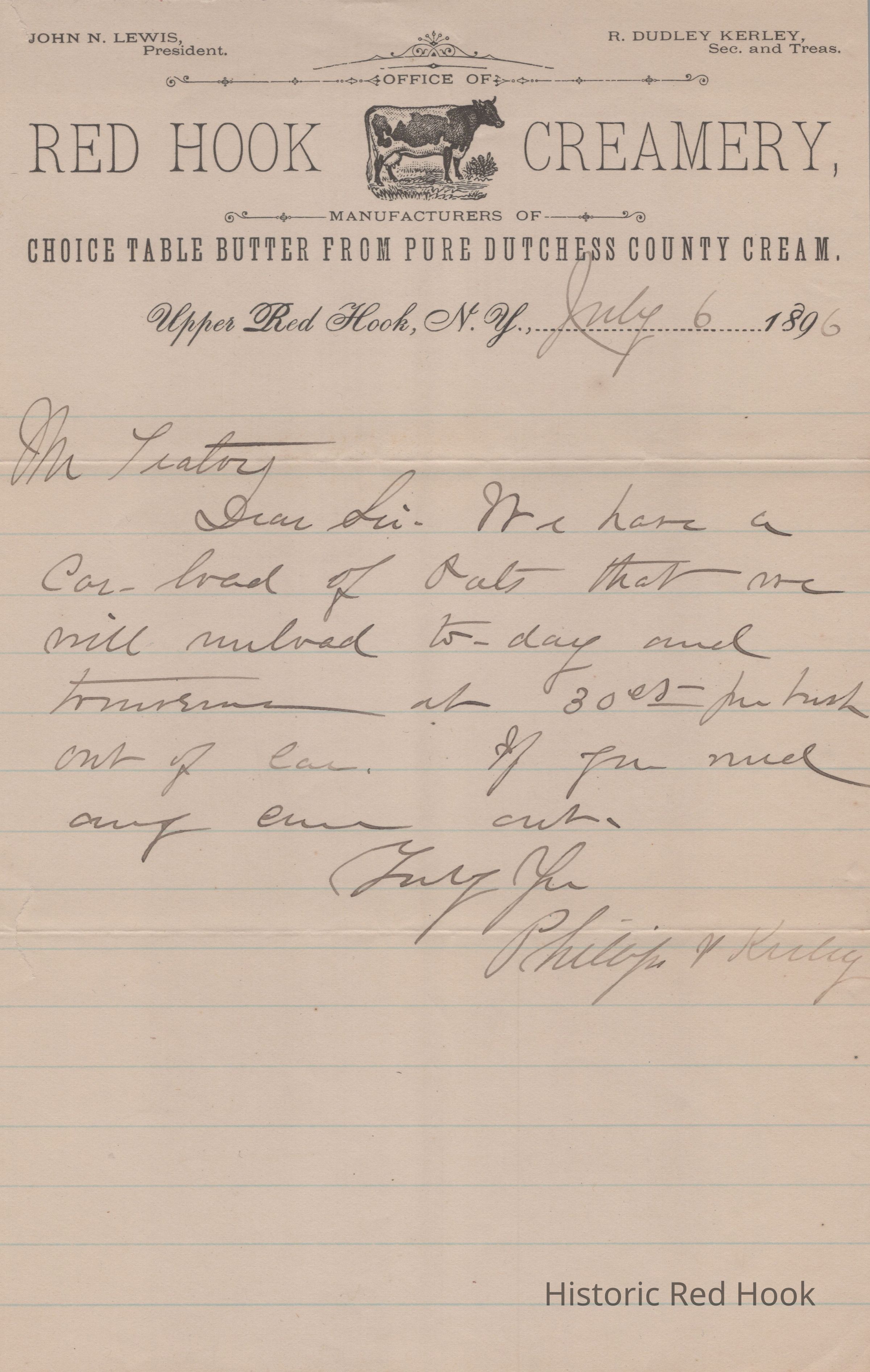 A notice written on Red Hook Creamery stationary date July 6, 1896 notifying Mr. Teator of the arrival of Oats.Relationships