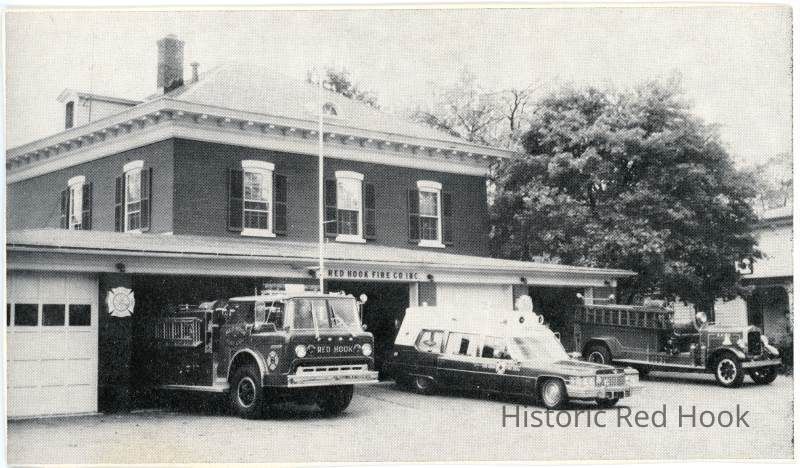 Red Hook Fire Company building with vintage fire truck, fire truck c 1970? and ambulance out front, printed on card.Photograph Details