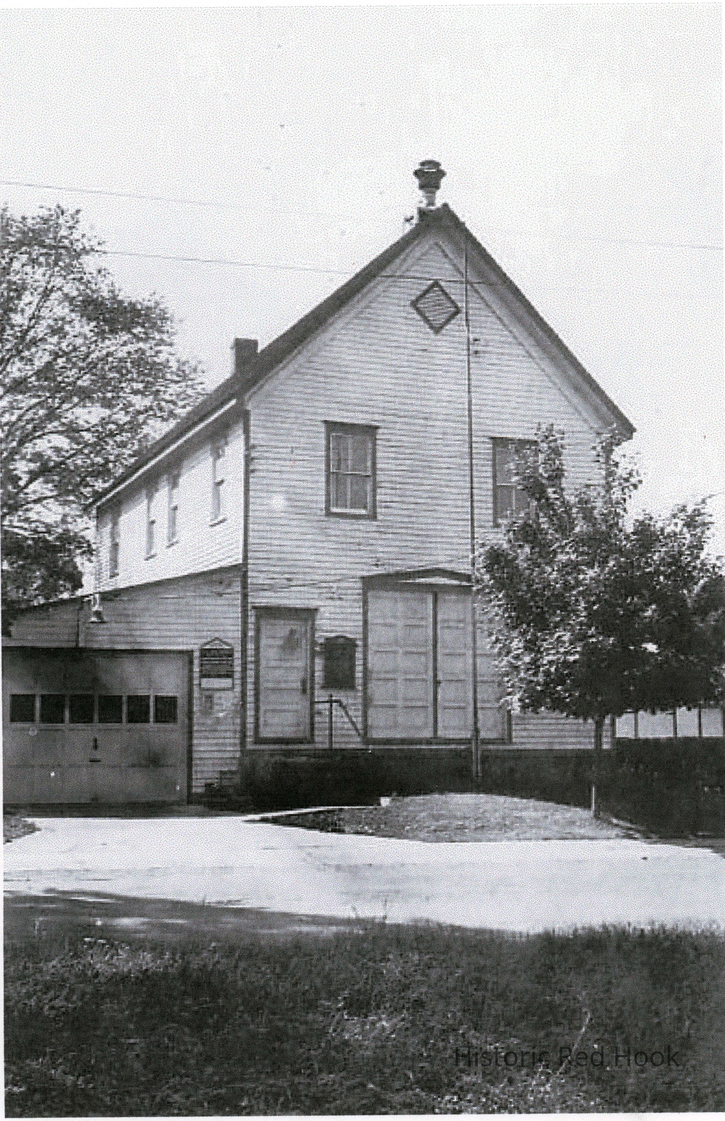 Red Hook Volunteer Fire Department building, Prince Street, with siren on top, circa 1930s; department later moved across South Broadway to the Sittingham house, a brick house remodeled into three bays to accommodate newer, larger equipment, and which now anchors Firehouse Plaza. The building later housed the Grange.Photograph Details