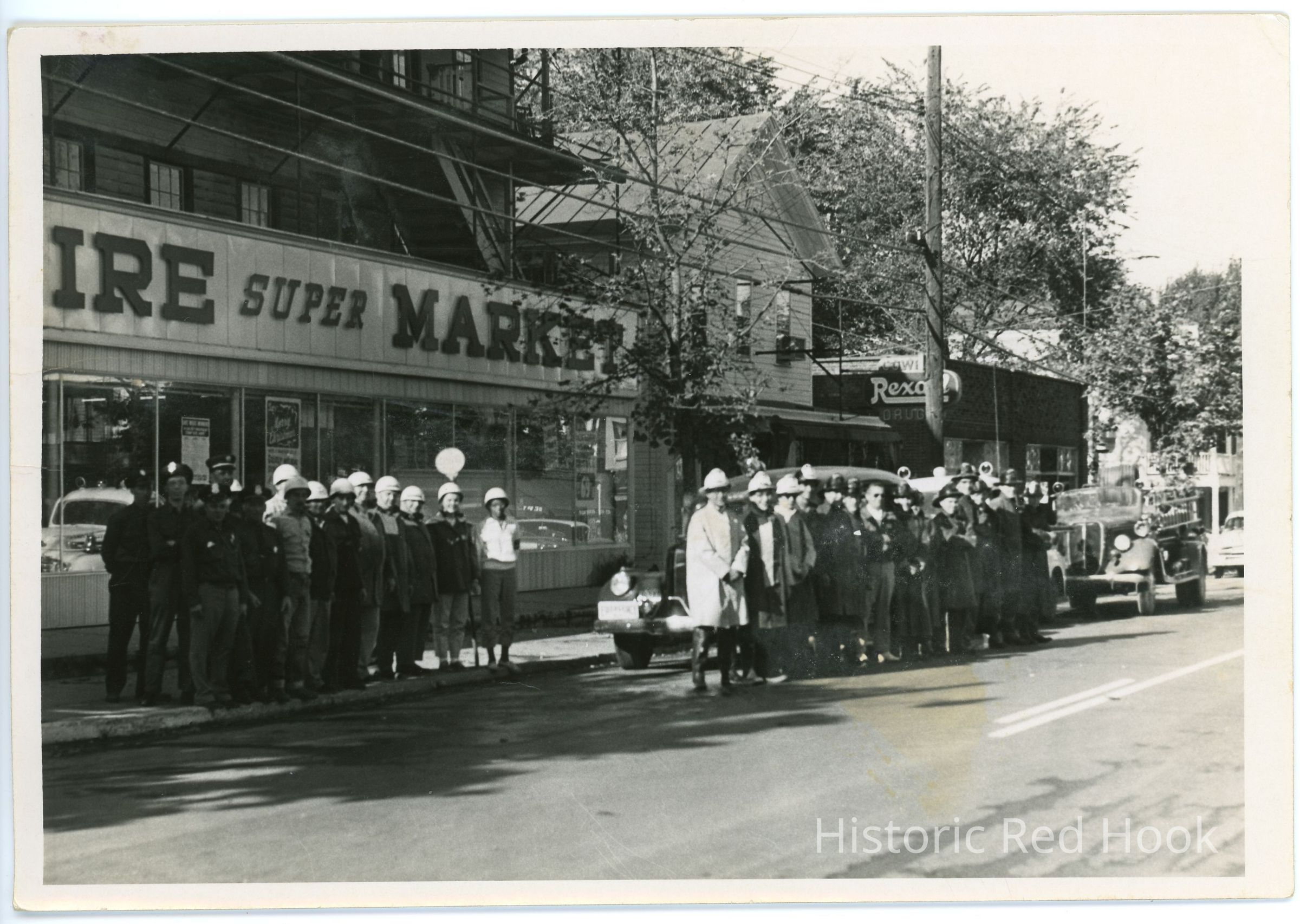 Scene of Red Hook Fire Department firemen lined up in front of Empire Super Market in Hobbs Building on South Broadway, early 1950s.Photograph Details