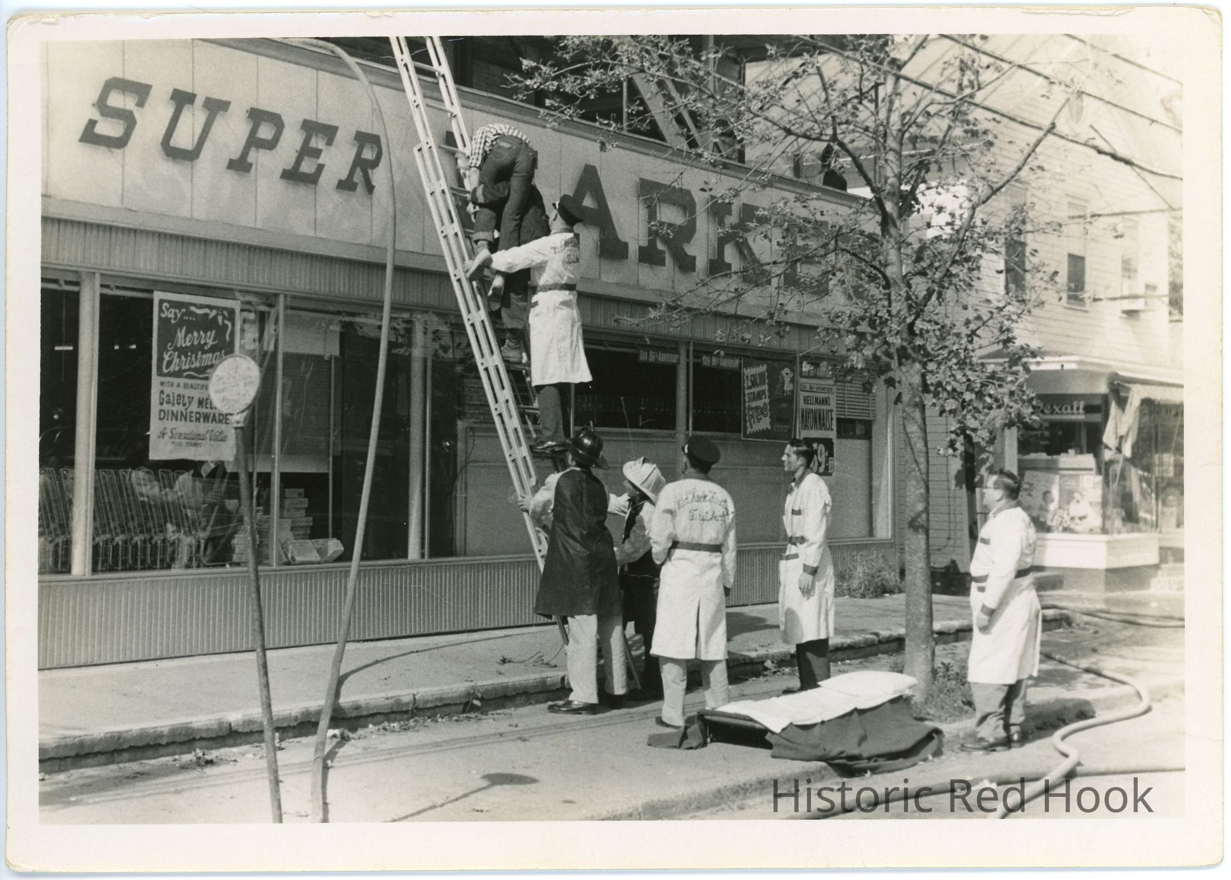 Scene of Red Hook Fire Department rescue on South Broadway above old Empire Super Market in Hobbs Building, early 1950sPhotograph Details