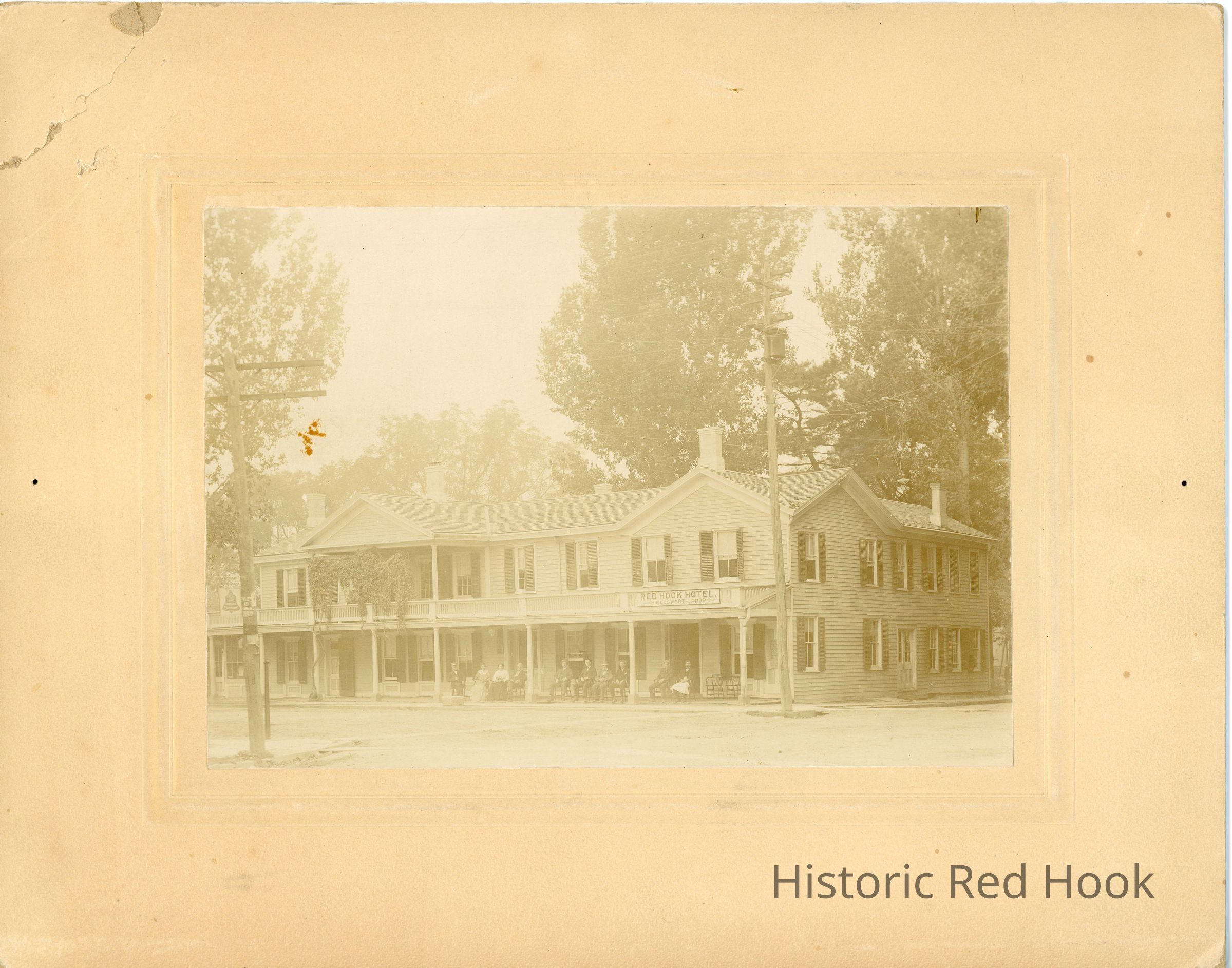 Red Hook Hotel, ca 1909, with people sitting on front porch. Original print on cardboard and colorized photocopy of same image.Photograph Details