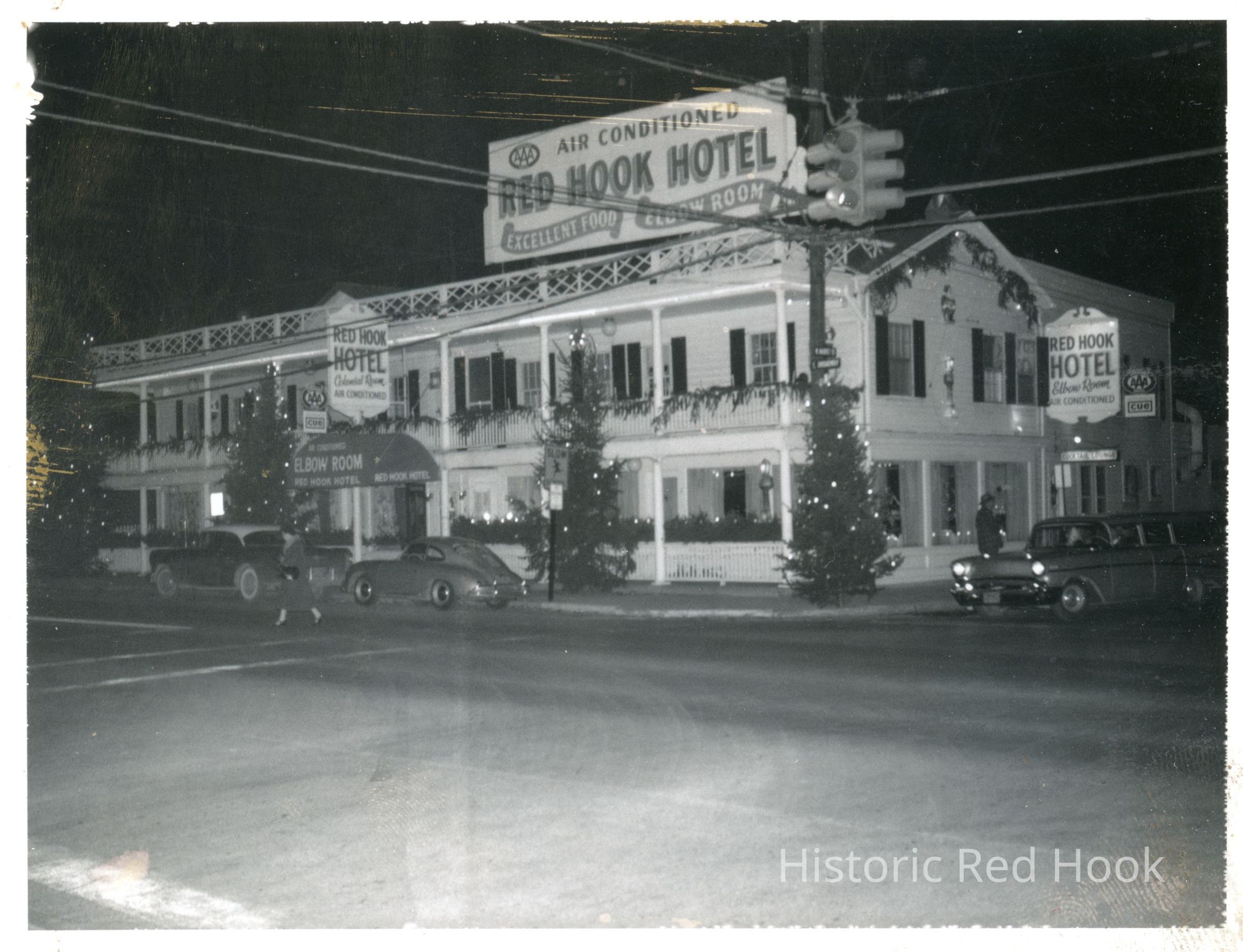 Night time view of Red Hook Hotel, decorated for the Christmas holidays. Written on back "Christmas 1959, Donated by F. P. Hart. Jr.