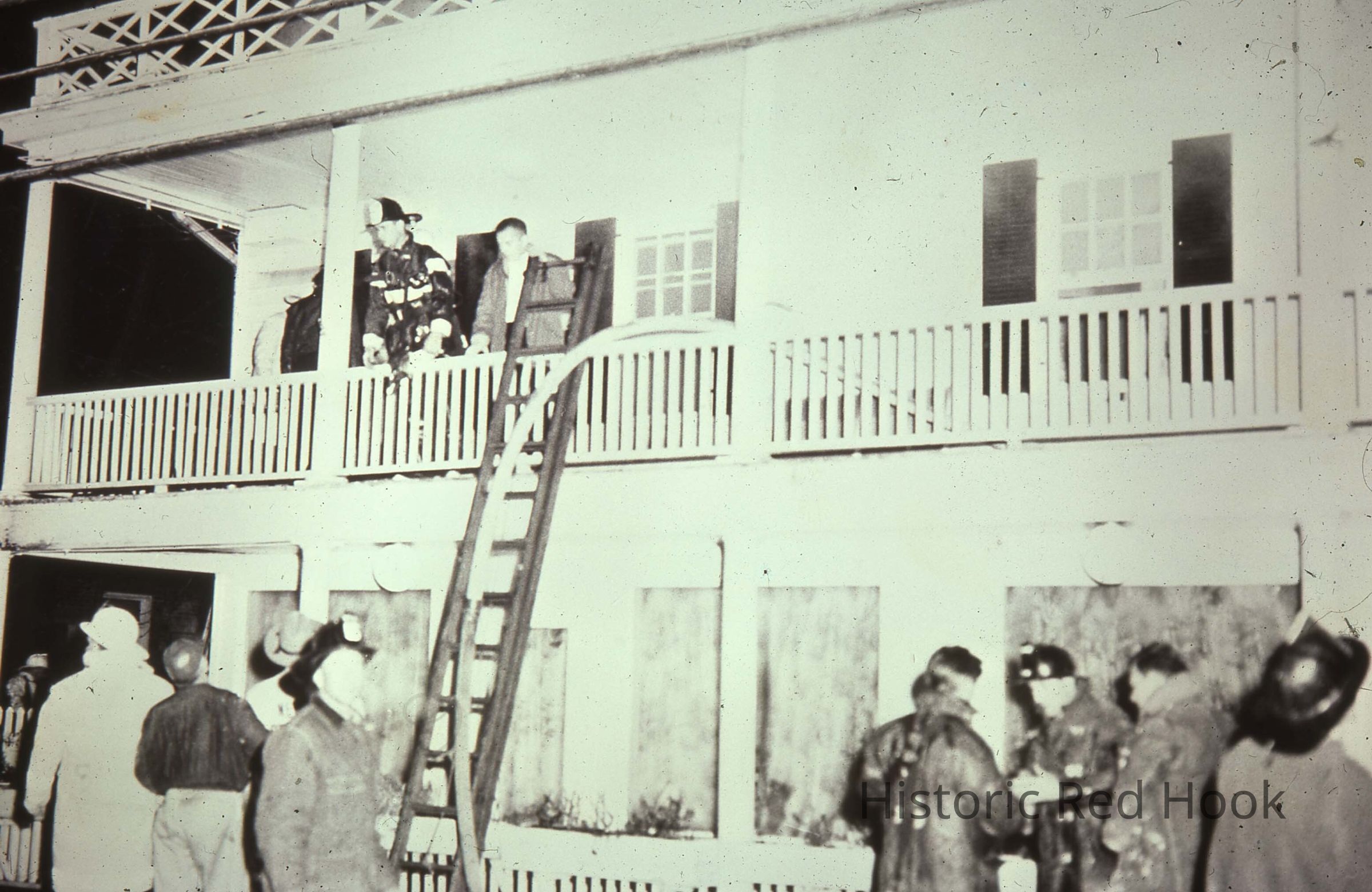 View of Red Hook Hotel with fireman on balcony and firehose and ladder, January 1963Photograph Details