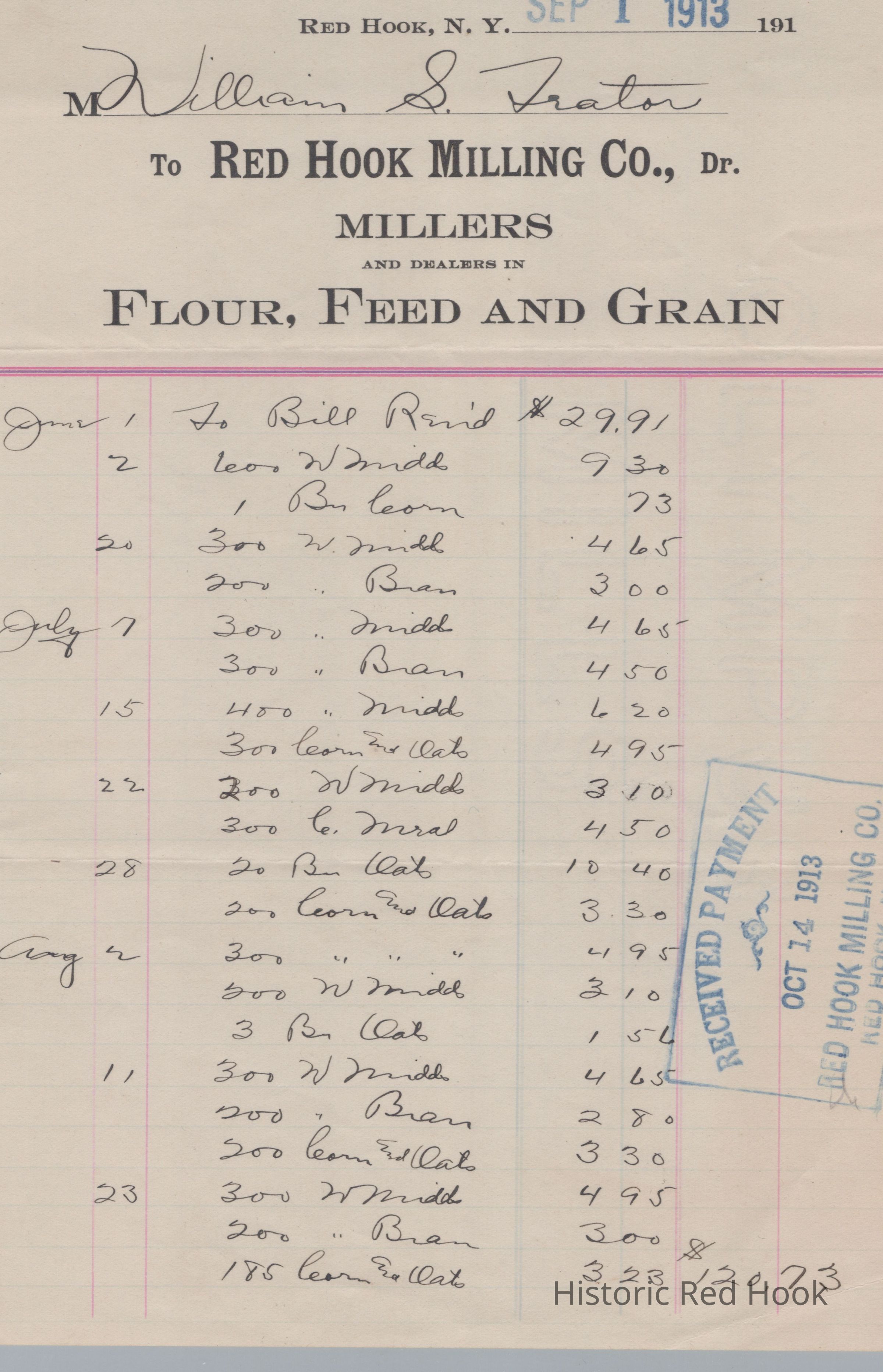 Red Hook Milling Co.a receipt dated September 11, 1913 to William S. Teator for $120.73.Relationships