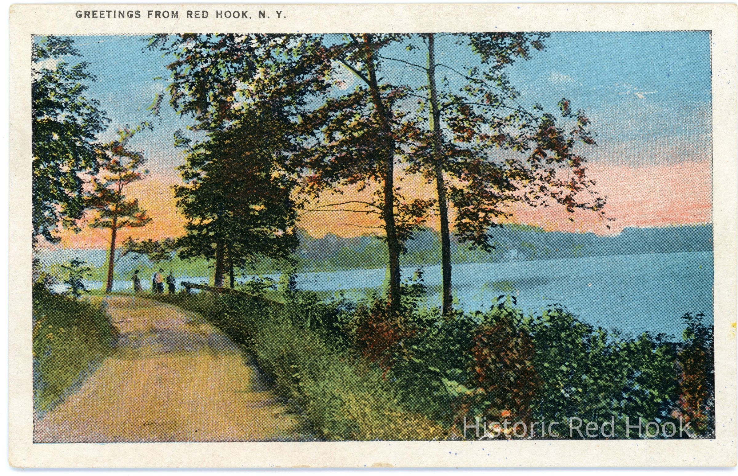 Greetings from Red Hook, N.Y. Color illustration of people standing on a road by a lake (Spring Lake?)Collection