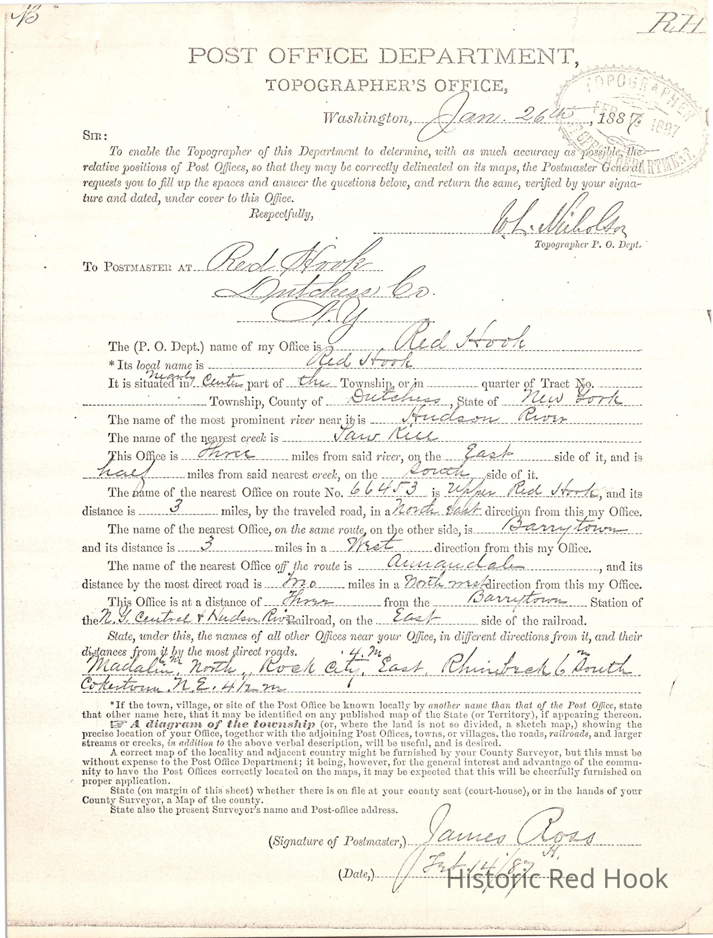 A request dated Jan. 26th 1887 from the Topographer's office of the US Postal Department for information so that the Red Hook post office may be properly delineated on its maps.Archive Items Details