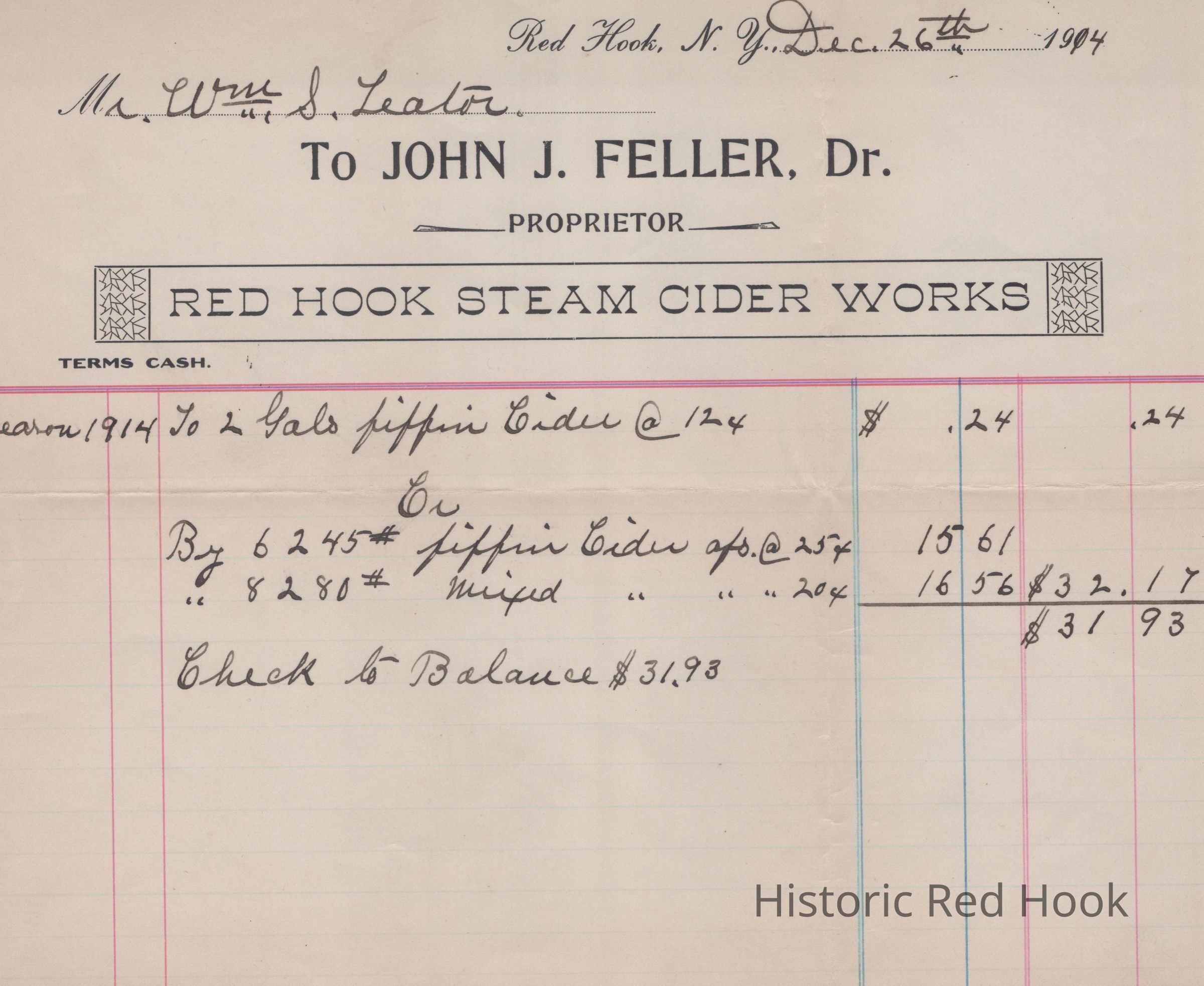 Invoice from Red Hook Steam Cider Works, John J. Feller, Proprietor, dated December 26, 1914, to William S. Teator for Pippin (apple) Cider and Mixed (apple) Cider.Relationships