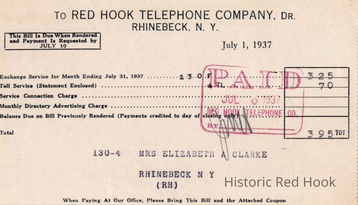 Receipt for monthly exchange service, dated July 1, 1937, from Red Hook Telephone Company to Elizabeth A. Clarke (Alice Benson's mother).Relationships