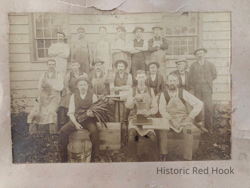 Photo of tobacco workers c 1880, Red Hook Tobacco Factory. Sixth man from left is Charlie Stickle.