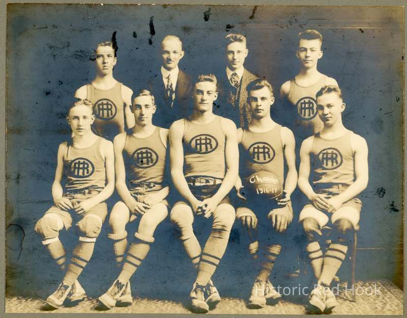 Red Hook Basketball team from 1916-17 with ball on their lap that says Champs 1916-1917
