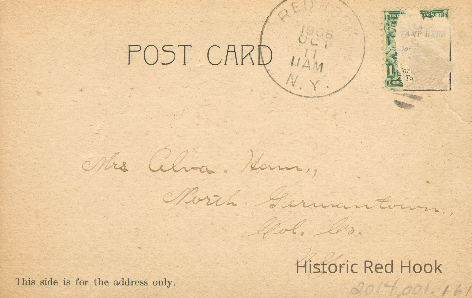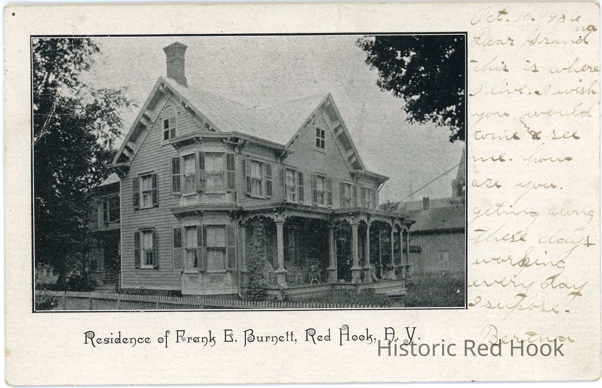 Black and white postcard showing Residence of Frank E. Burnett on South Broadway, Village of Red Hook. Postmarked Oct 11, 1906.