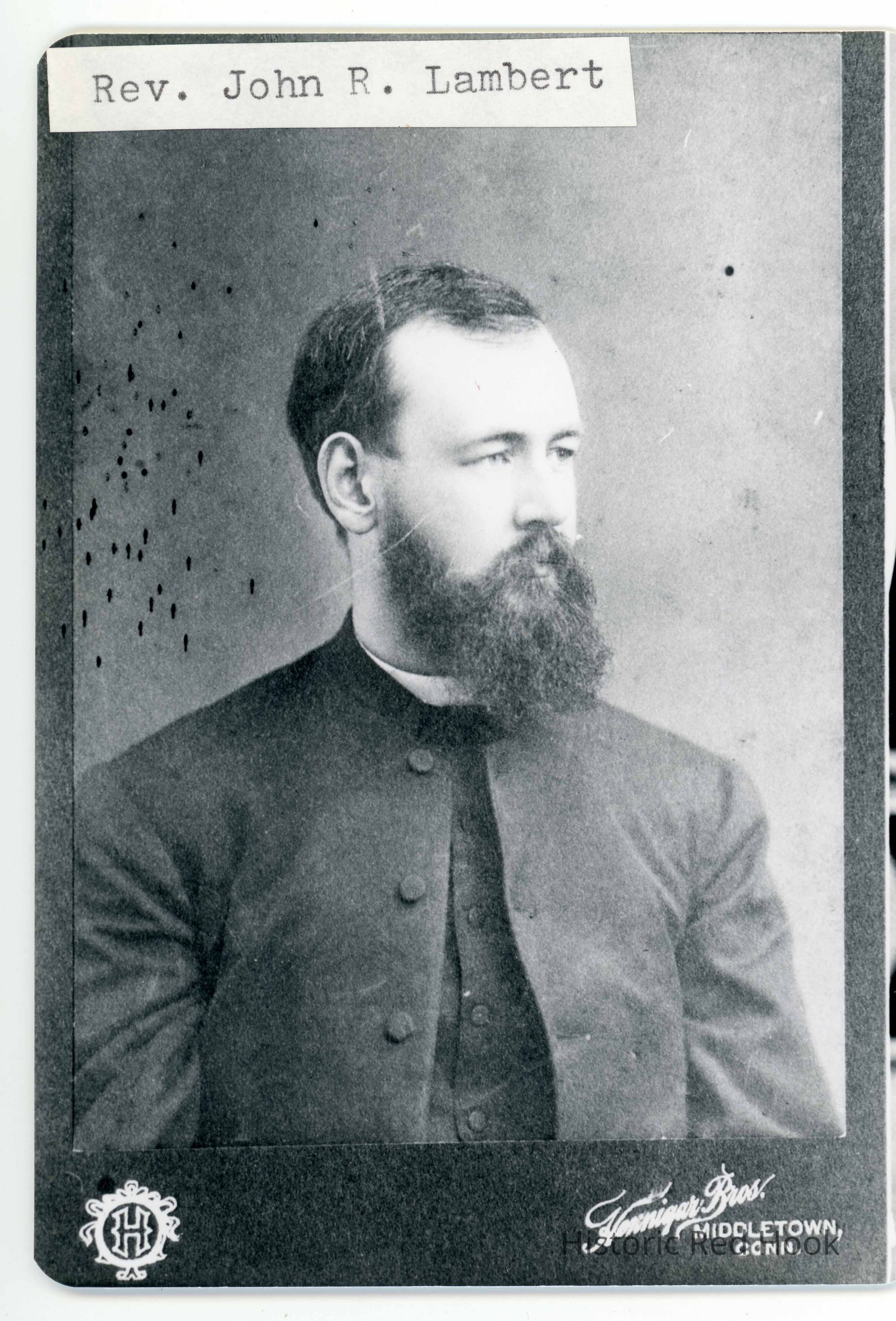 A formal head and shoulders portrait of a bearded man taken at Henniger Bros. Middletown Conn., identified as Rev. John R. LambertPhotograph Details