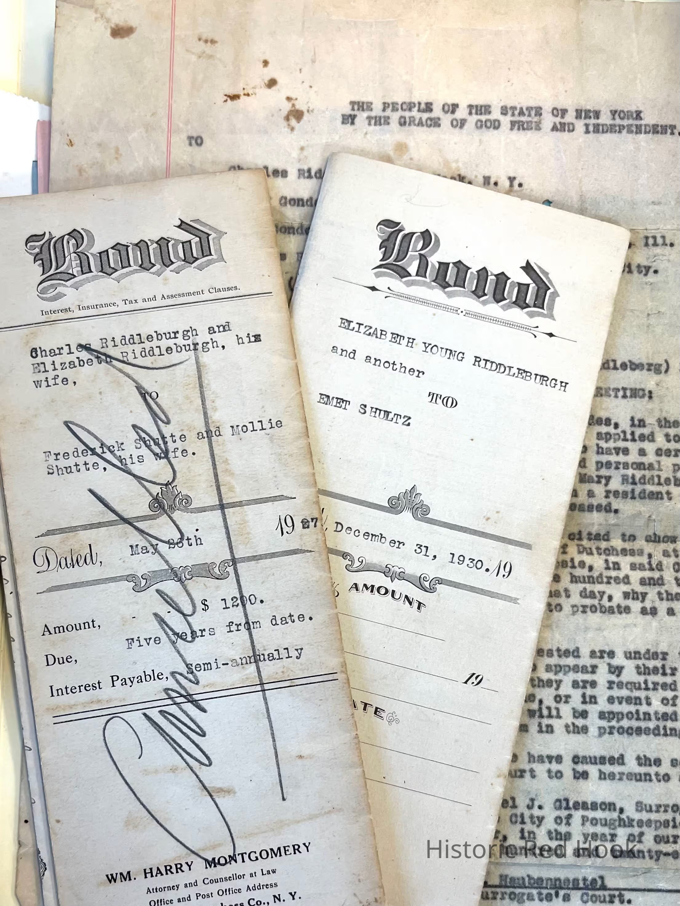 -Bonds (2), 1927 between Charles Riddleburgh and Elizabeth Riddleburgh unto Frederick Shutte and Molly Shutte of Town of Red Hook, and 1930 between Emet Shultz unto Elizabeth Riddleburgh and Charles Riddleburgh, with listings of amounts owed