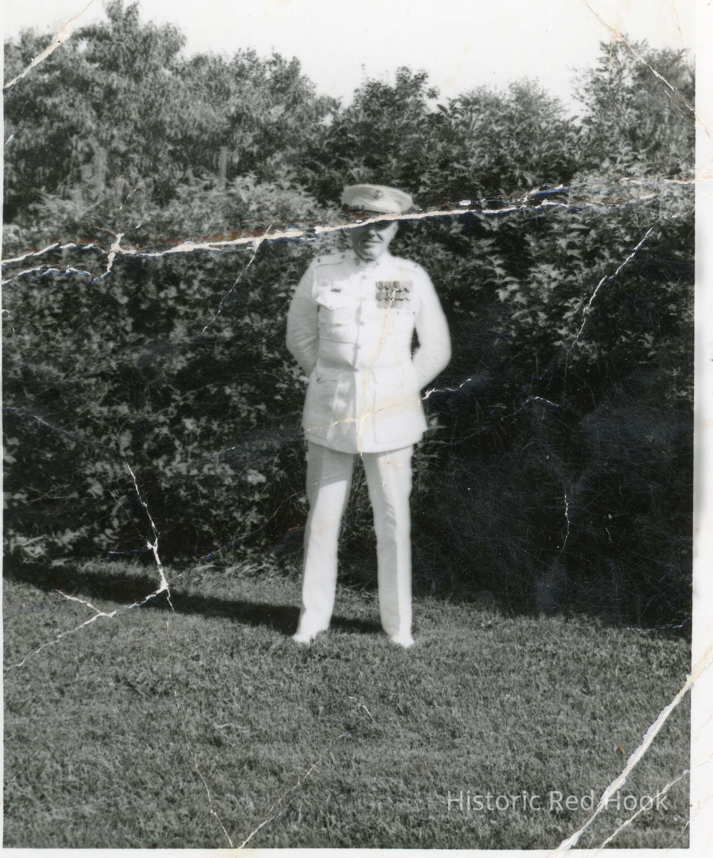 Robert C. Schutte in white military uniform standing in front of hedge.Photograph Details