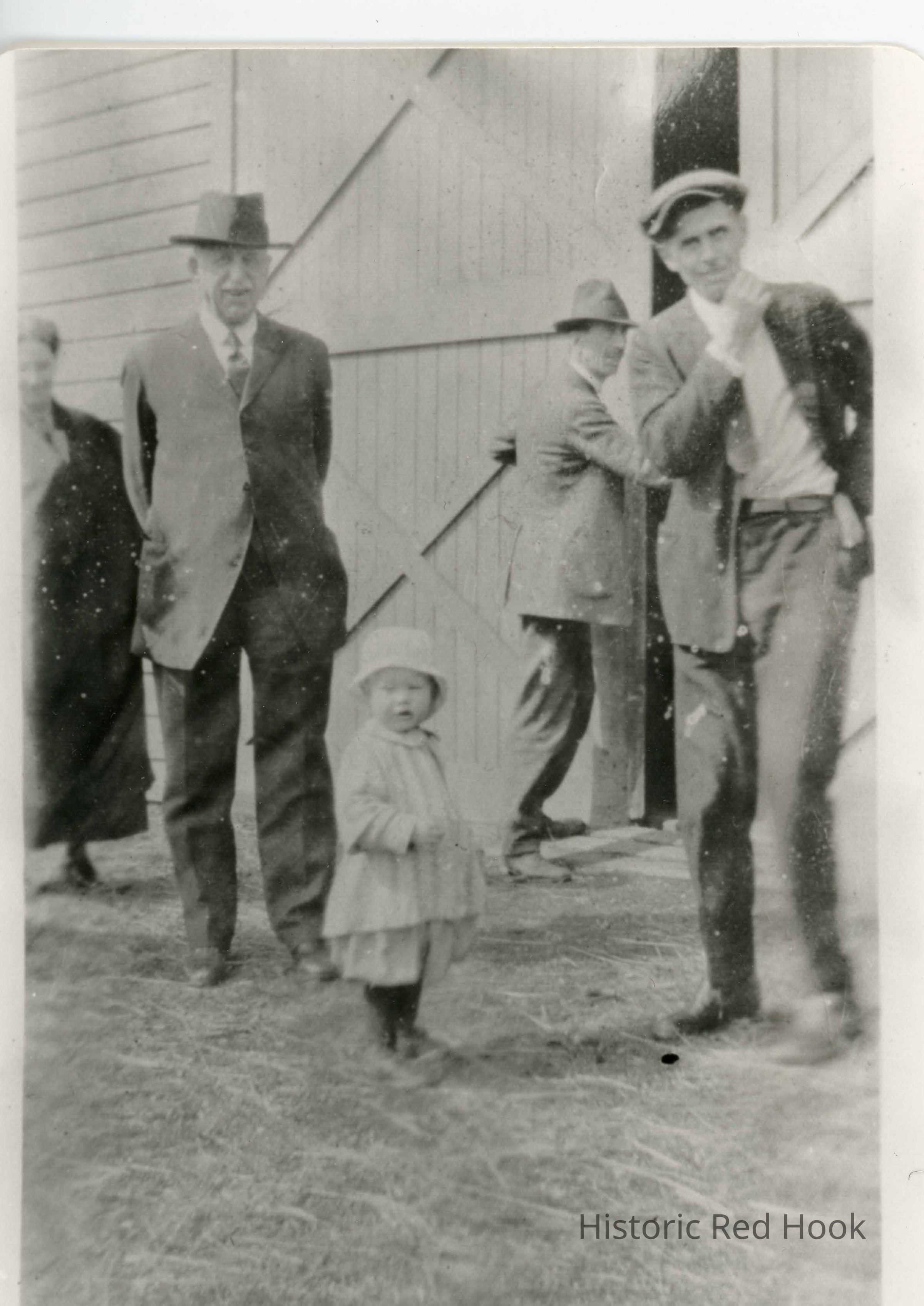 Three men, a woman and a toddler standing outside of a barn identified from left to right as: