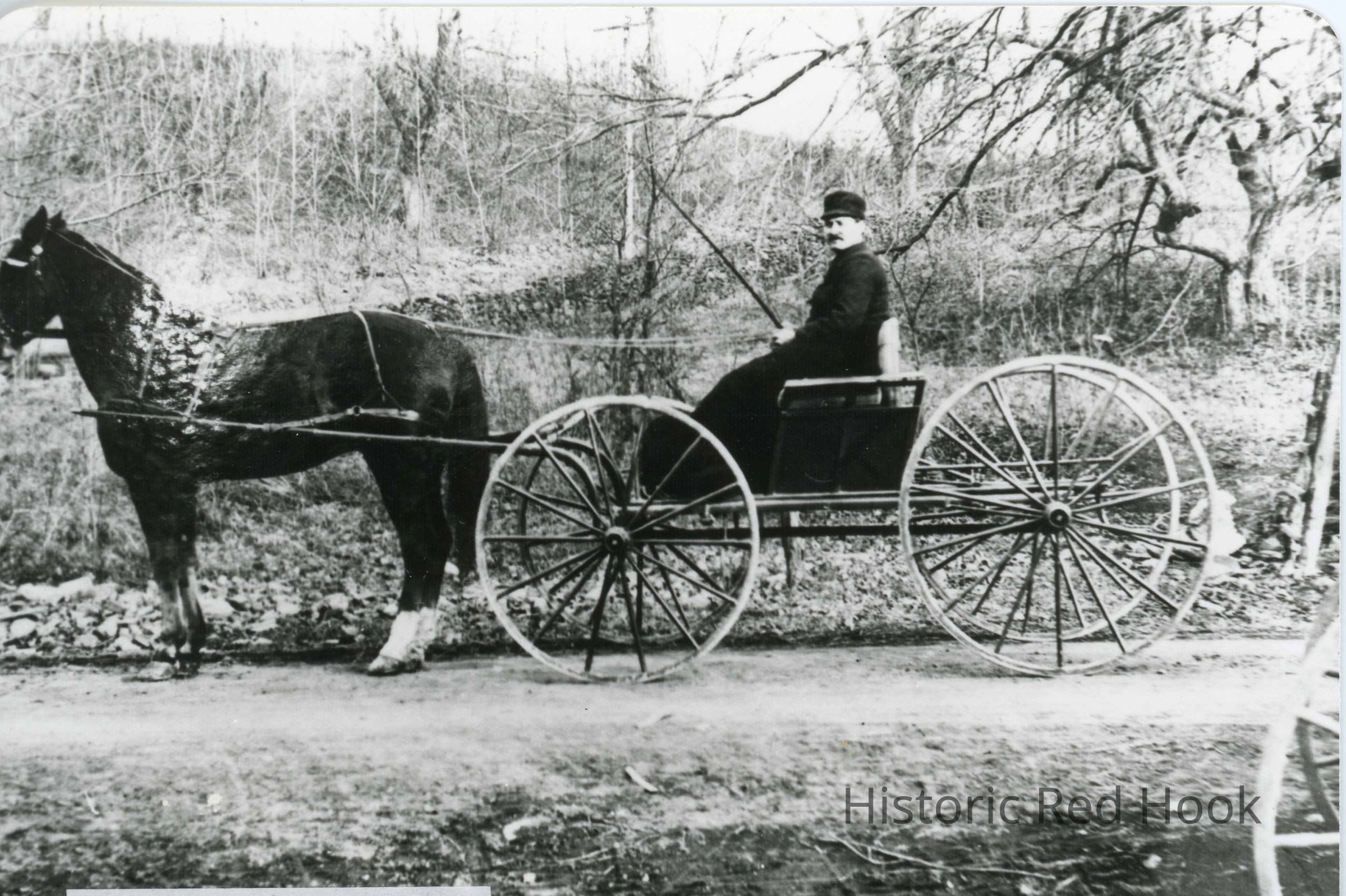 Man identified as Robert Navins pictured in horse drawn buggy.