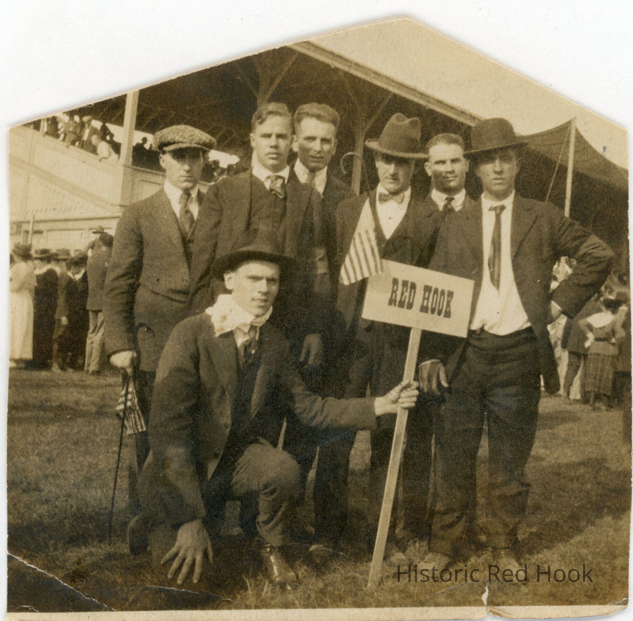 Roland A'Brial and fellow soldiers with Red Hook sign after returning from military service in World War I