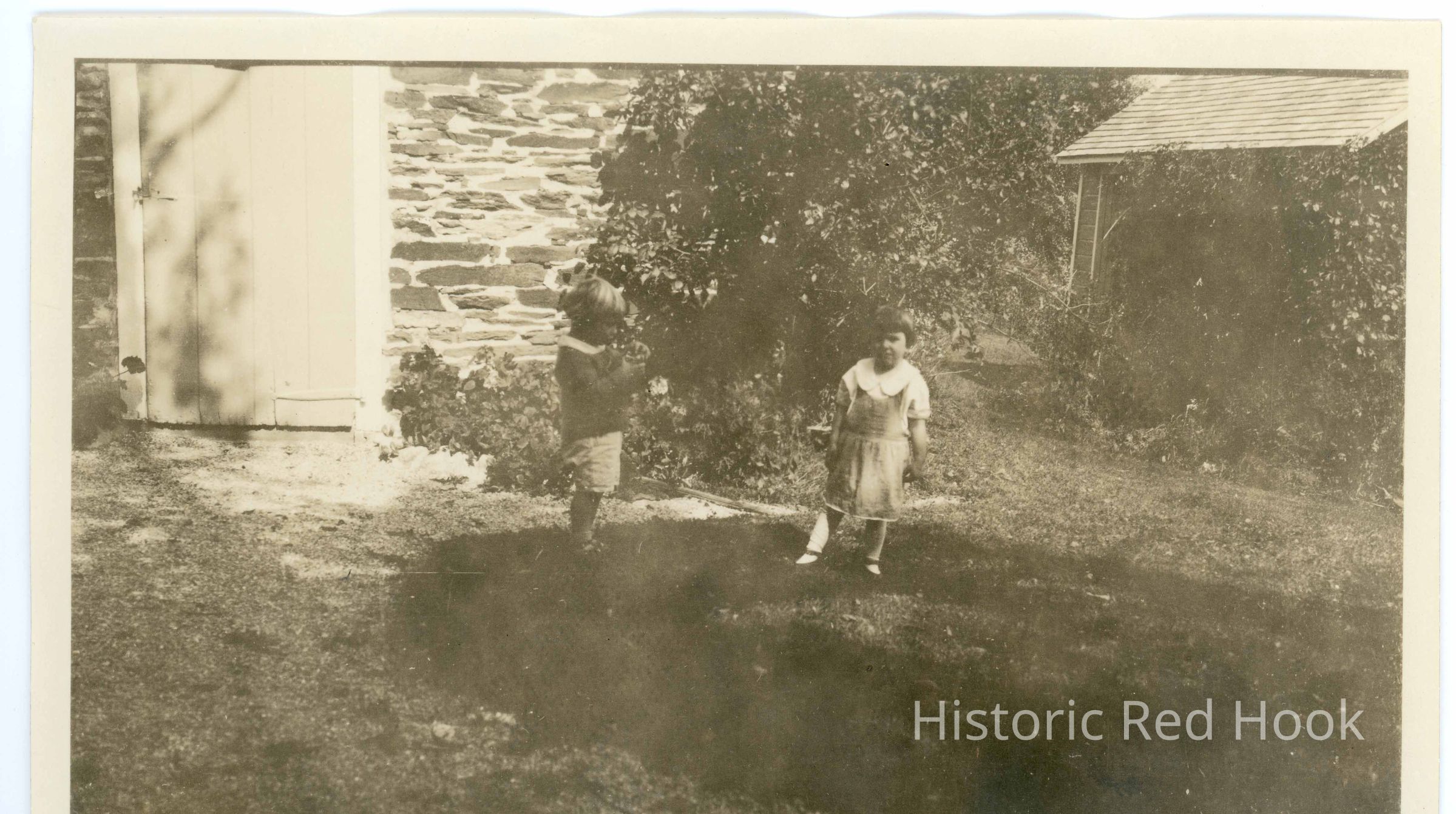 Outdoor photograph of two children on lawn identified as Ron Losee and Jeannette TeatorPhotograph Details