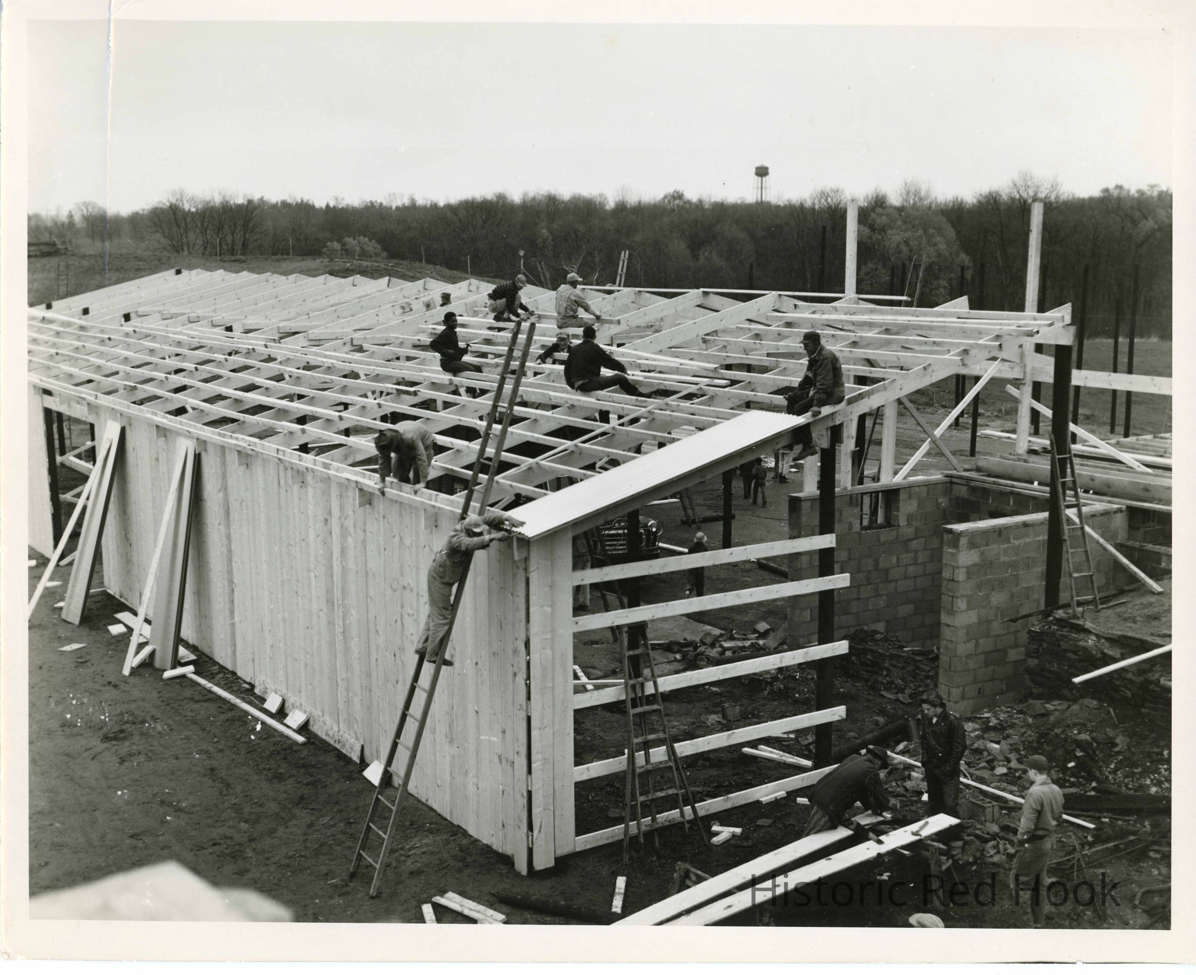 Barn-raising on Thomson property. Workers hammering and adding roof supports and beginning to add first section of roof.Collection