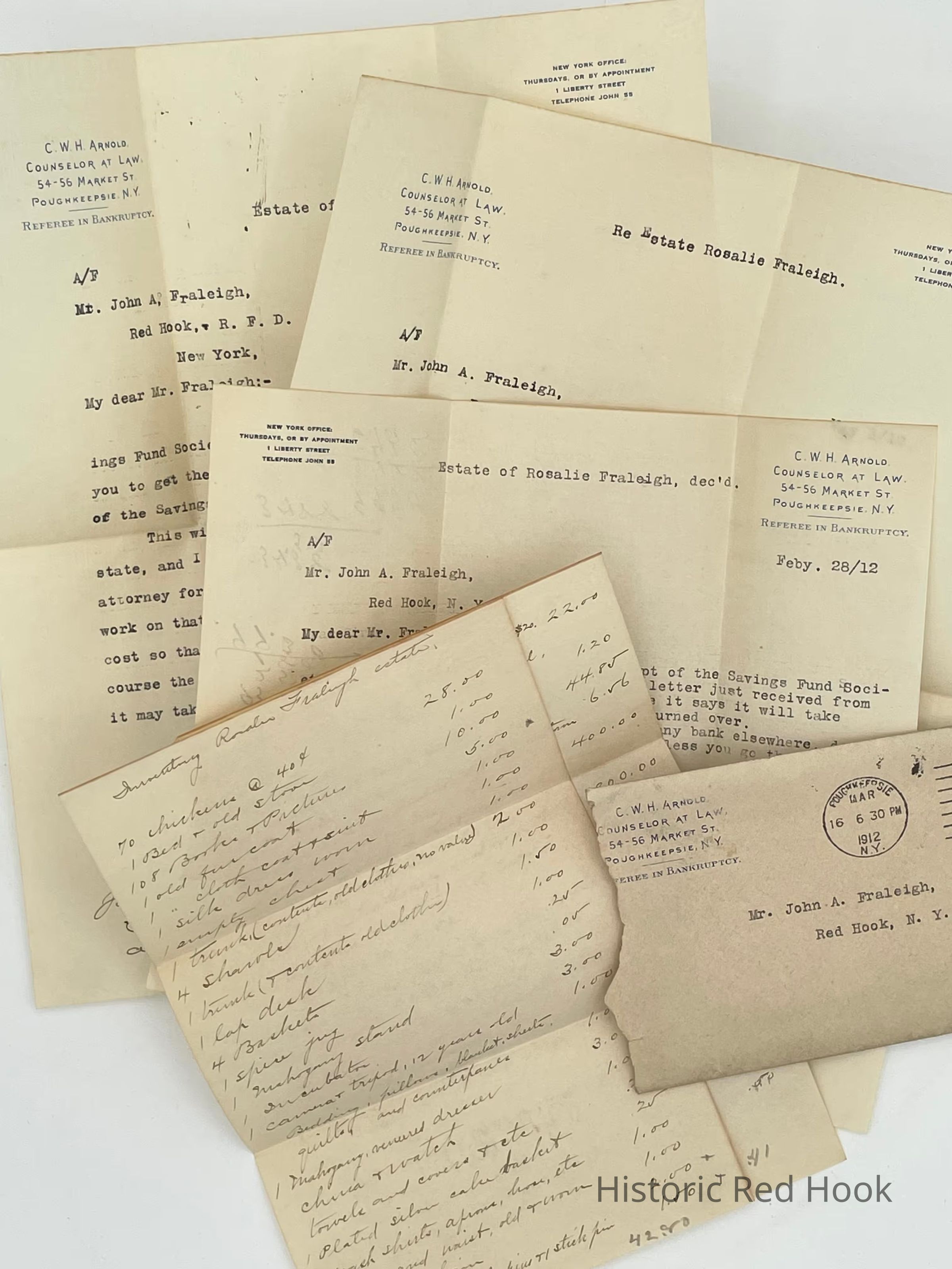 Letters from C.W.H. Arnold, Counselor at Law, concerning the estate of Rosalie M. Fraleigh and inventory of her estate.Collection