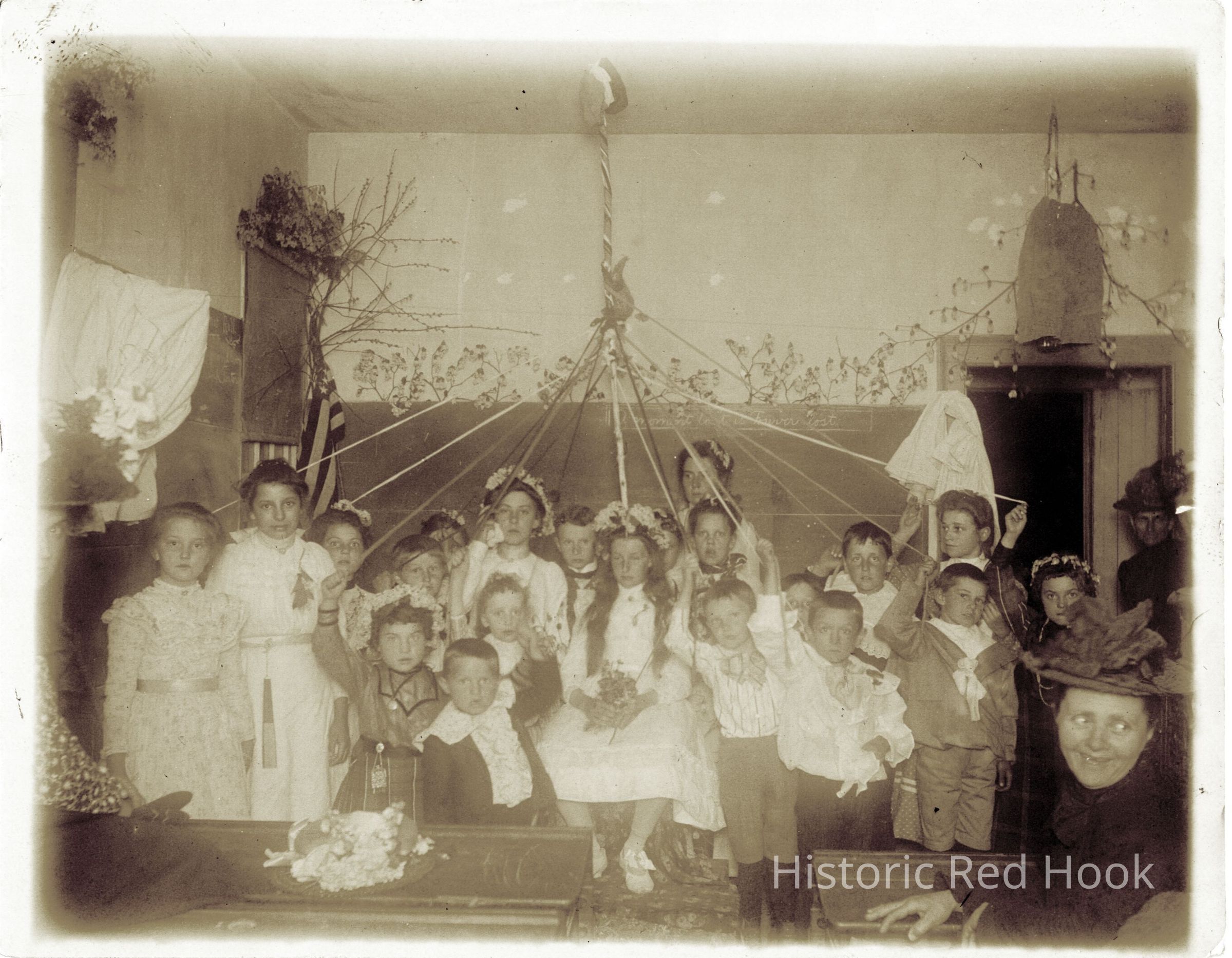 Photograph mounted on cardboard of teacher Rosalie Fraleigh and her class at the Fraleigh School engaged in a maypole activity, May 1902. Rosalie Fraleigh taught from 1889 to 1906. The quote written at the top of the blackboard behind the class reads "A Moment Lost is Forever lost."Photograph Details