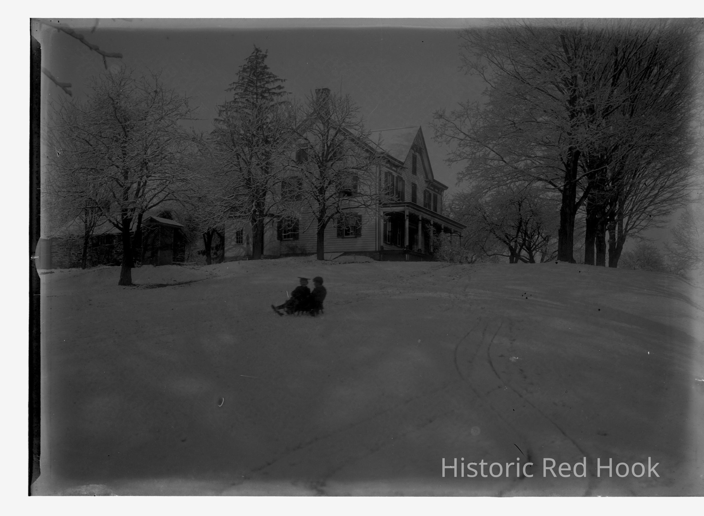 Roscoe and Marion Teator sledding, house in backgroundPhotograph Details
