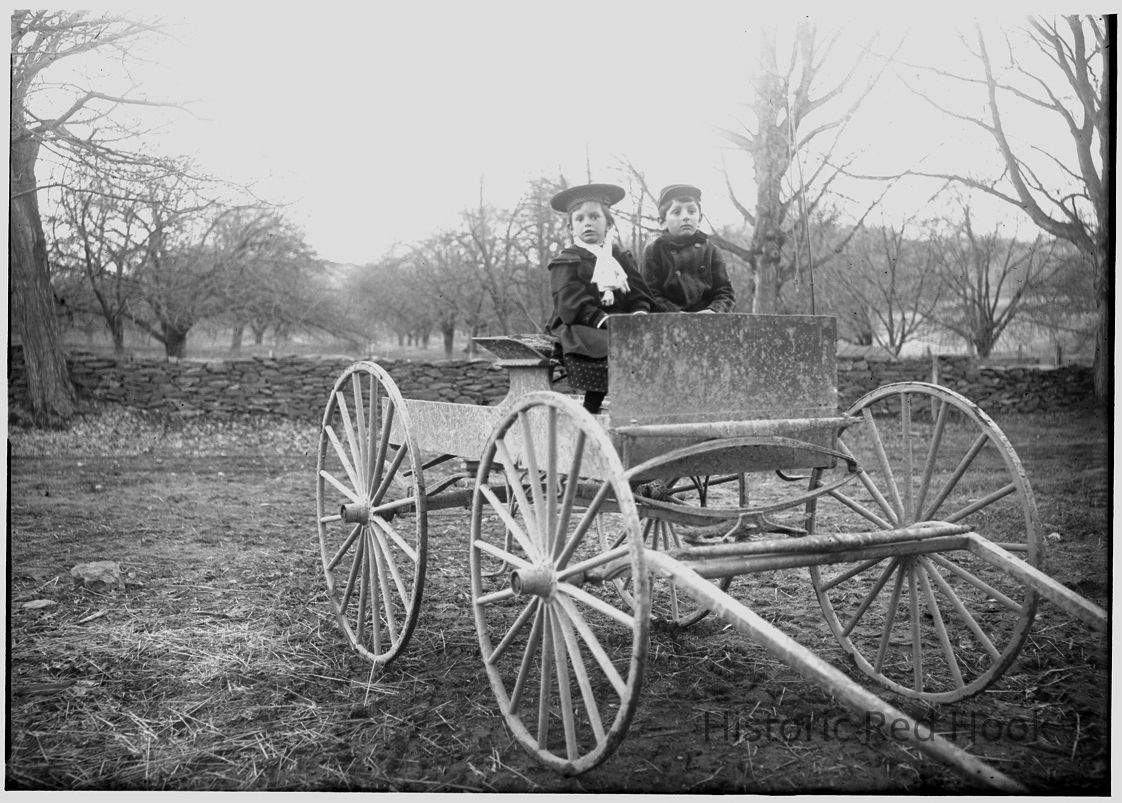 Marion and Roscoe Teator (8 and 10 years old) sitting in a wagon, c. 1903Photograph Details