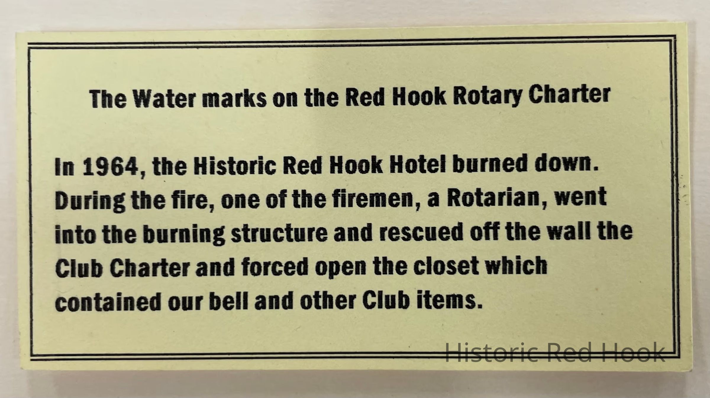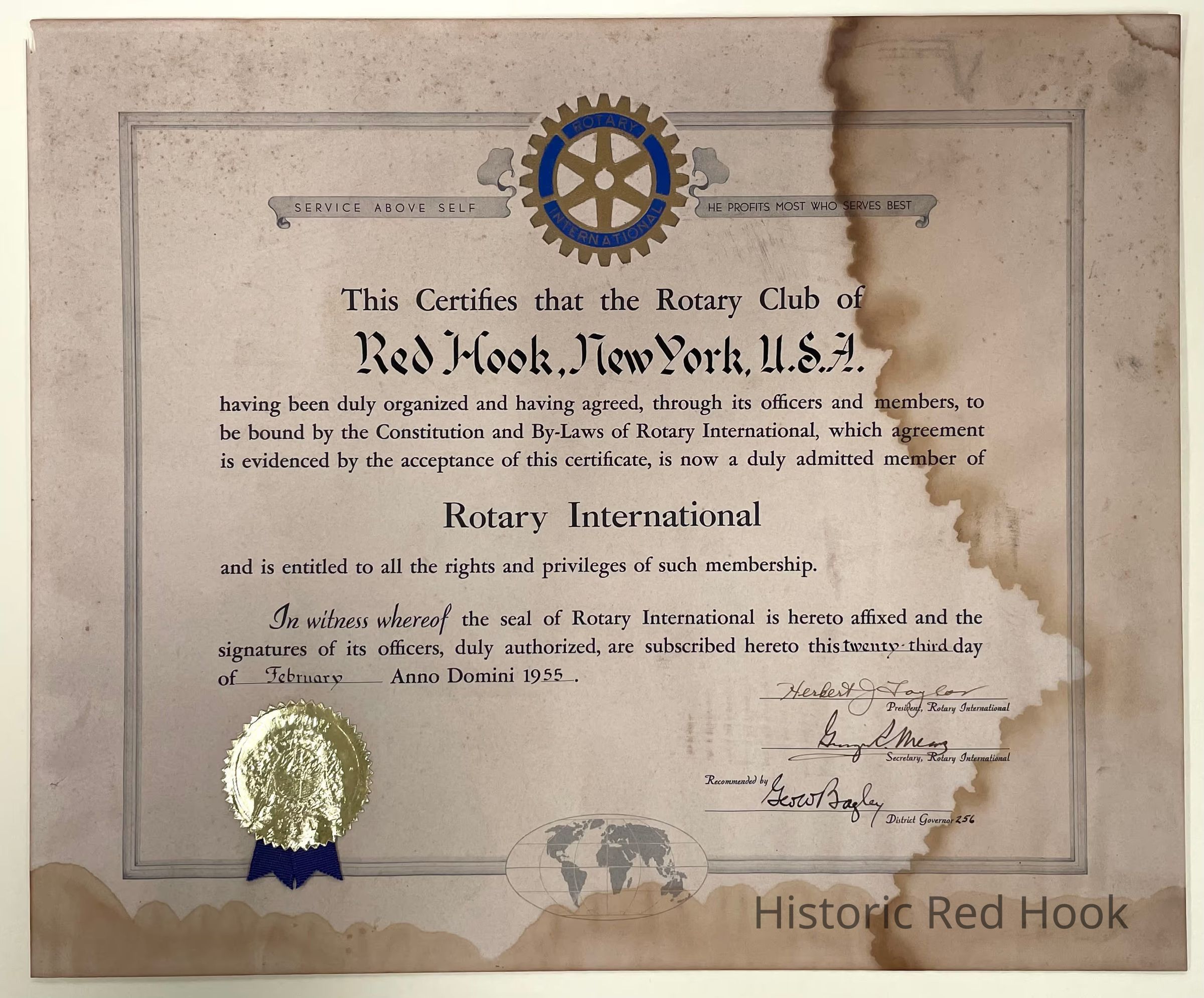 Rotary Club of Red Hook Certificate of Membership noting Red Hook Hotel acceptance into Rotary International.