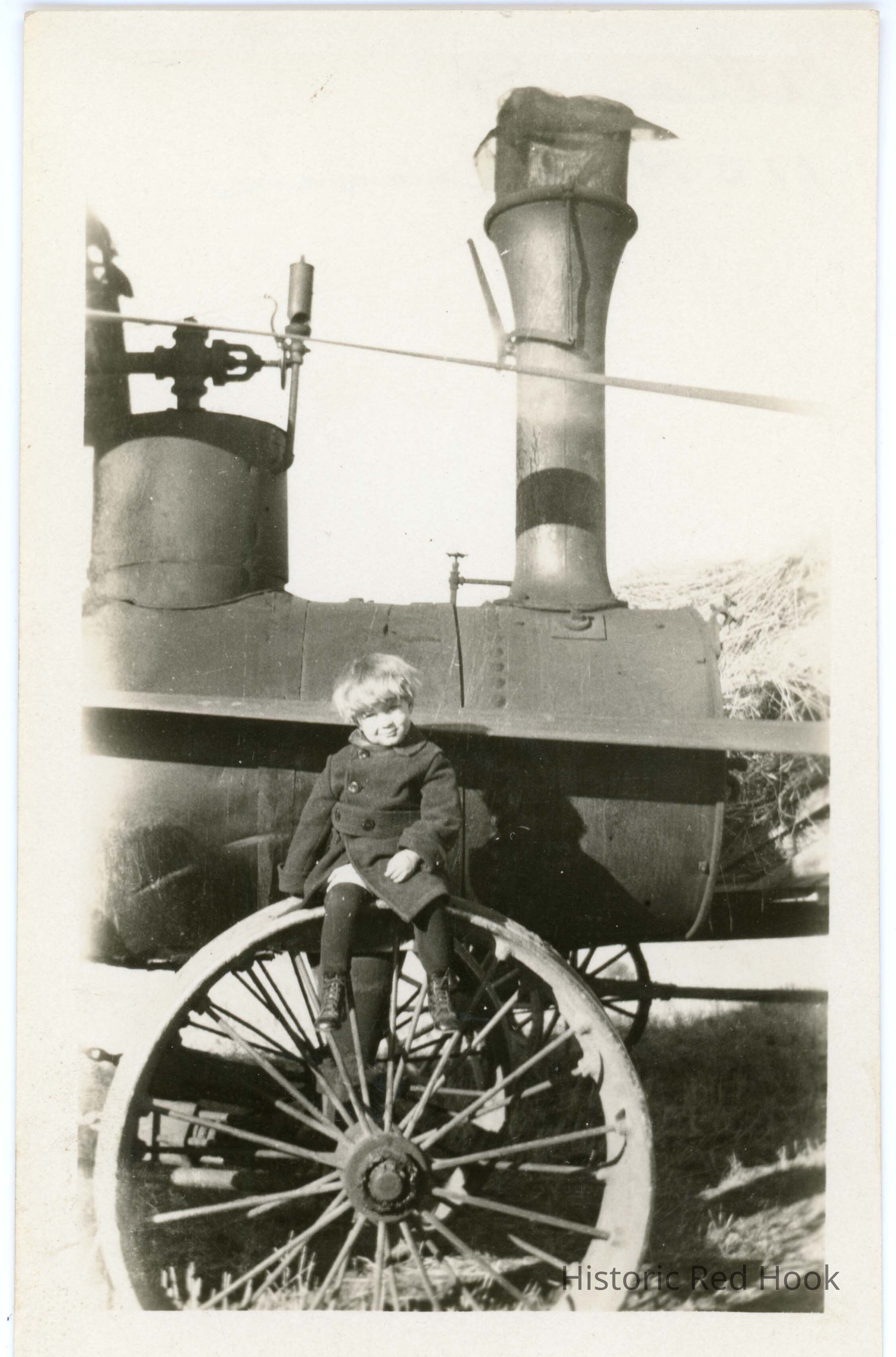 Rumely Oil Pull with boy sitting on wheel. Written back "Allan & 110 H.P. Reeves."