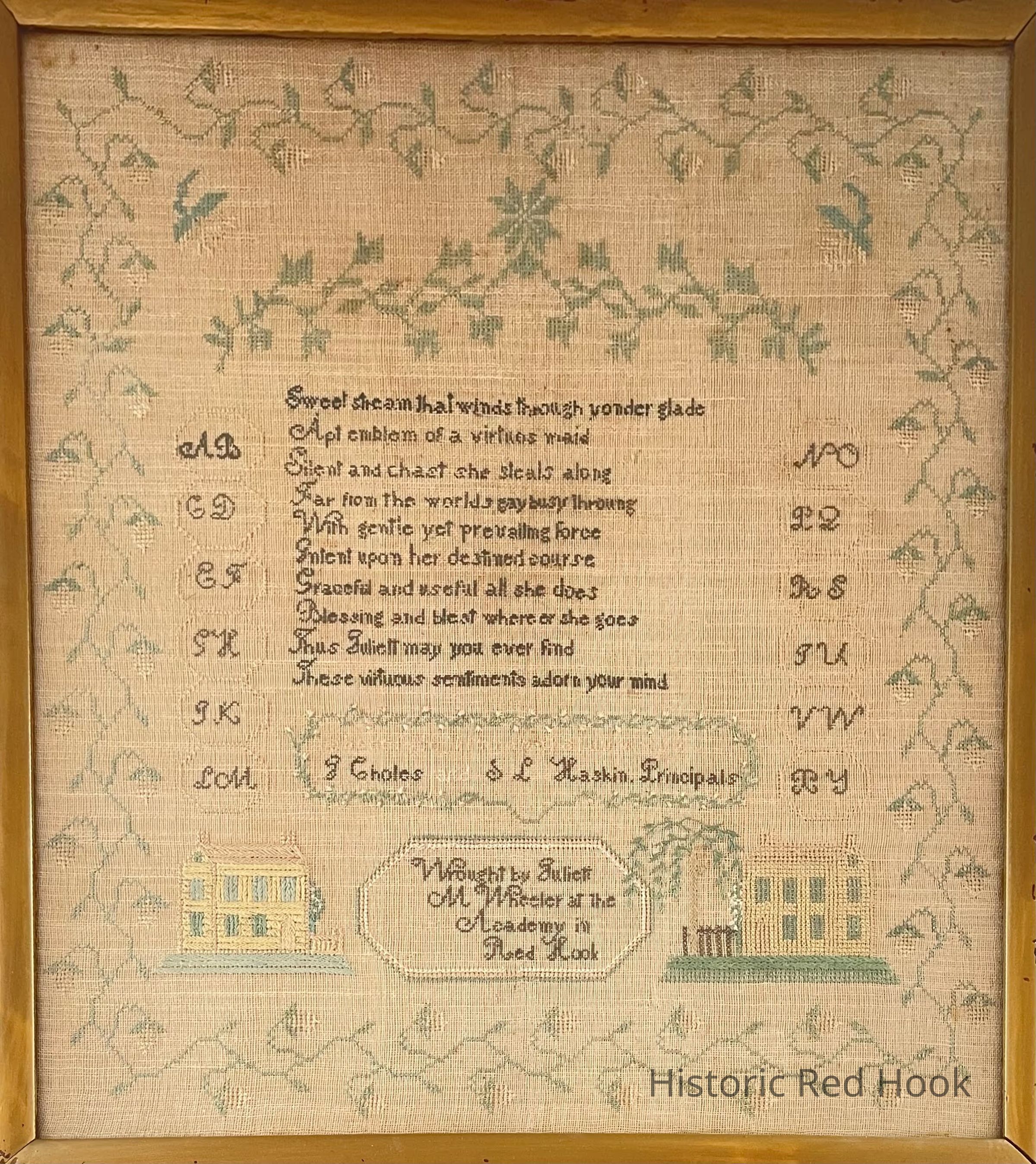 Handstitched sampler marked "Wrought by Juliett (Juliette) M. Wheeler at the Academy in Red Hook" circa 1825Relationships