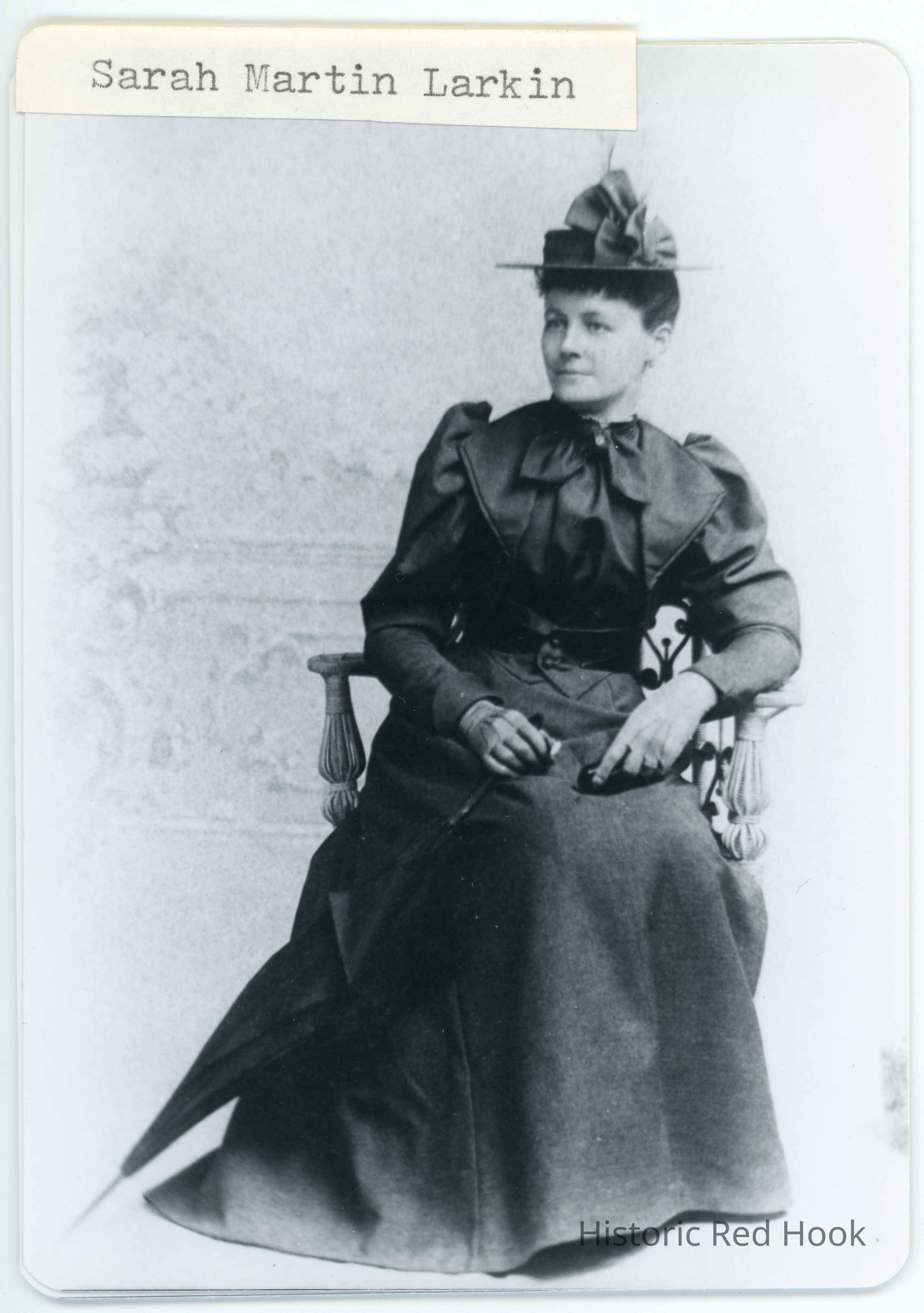Formal portrait of a woman seated in front of a fancy screen holding a parasol dentified as Sarah Martin LarkinPhotograph Details